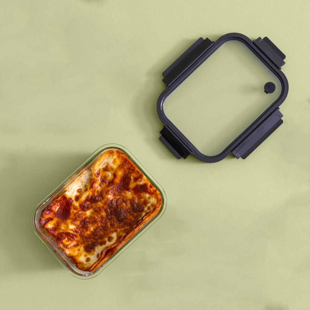 Φαγητοδοχείο με καπάκι με κλιπ που κλείνει αεροστεγώς. Είναι κατασκευασμένο από διάφανο βοριοπυριτικό γυαλί και έχει μαύρες πλαστικές λεπτομέρειες στο καπάκι. Είναι κατάλληλο για φούρνο μικροκυμάτων, πλυντήριο πιάτων και κατάψυξη. Διαθέτει βαλβίδα εξαερισμού ιδανική για χρήση σε φούρνο μικροκυμάτων. Μπορεί να μπει στον φούρνο χωρίς το καπάκι. Είναι κατάλληλο για φούρνο μικροκυμάτων, πλυντήριο πιάτων και κατάψυξη. Χωρητικότητα 900ml.