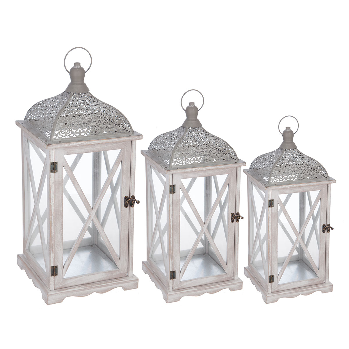 Φανάρια σε σετ 3 διαφορετικών μεγεθών με διάτρητο σχέδιο και έθνικ ύφος. Είναι κατασκευασμένα από ξύλο πεύκου σε απαλό γκρι χρώμα ενώ το πάνω μέρος είναι μεταλλικό. Μπορούν να κρεμαστούν εφόσον επιθυμείτε με τους δακτύλιους που διαθέτουν στο επάνω μέρος. Θα χαρίσουν απαλό και ρομαντικό φωτισμό σε όποιο χώρο του σπιτιού επιθυμείτε.