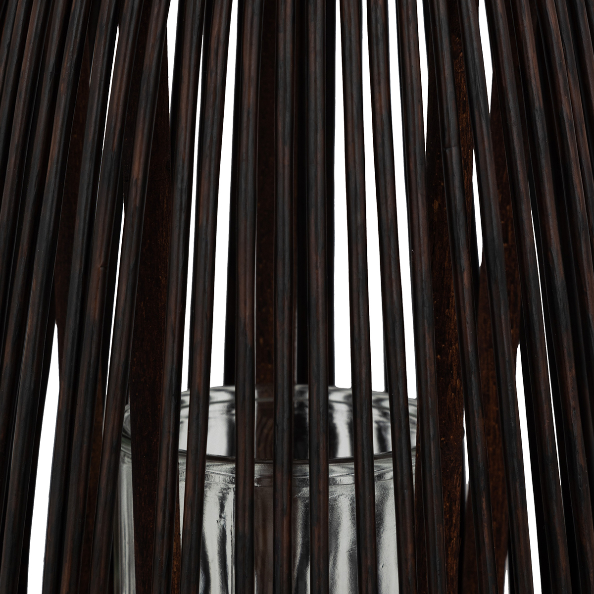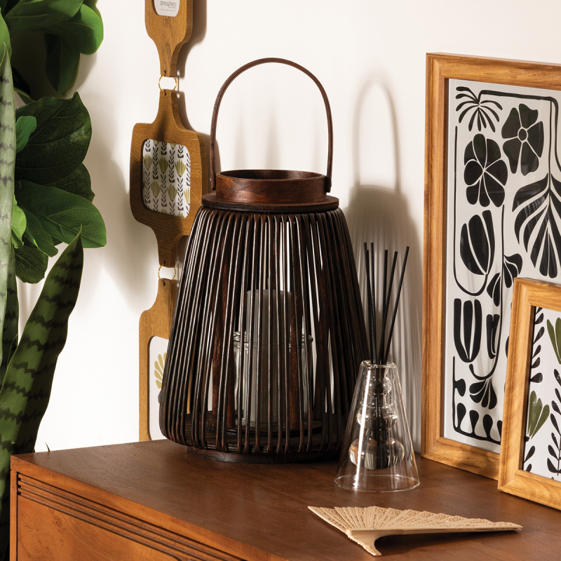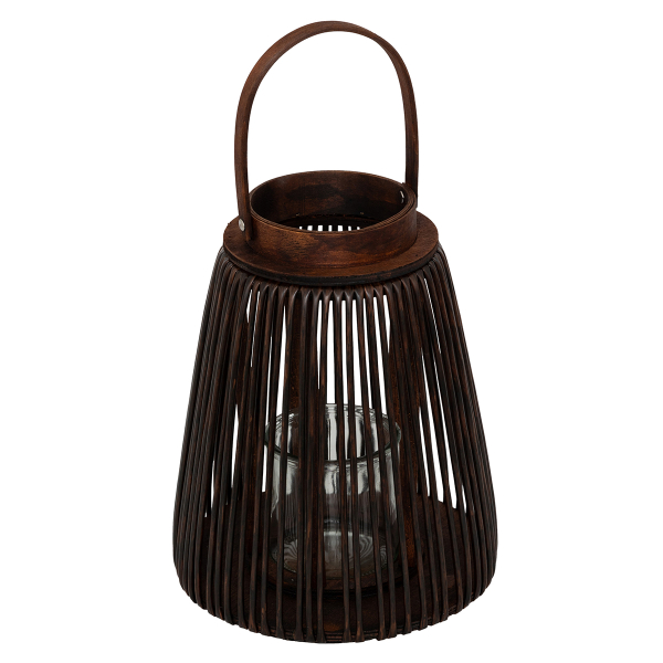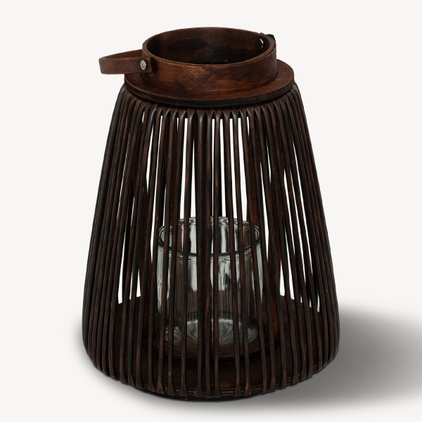 Φανάρι με διάτρητο σχέδιο και μοντέρνο ύφος. Είναι κατασκευασμένο από μοριοσανίδα_E1 σε καφέ χρώμα. Στο εσωτερικό διαθέτει γυάλινο ποτηράκι για την τοποθέτηση του κεριού. Μπορεί να κρεμαστεί εφόσον επιθυμείτε με τη λαβή που διαθέτει στο επάνω μέρος. Θα χαρίσει απαλό και ρομαντικό φωτισμό σε όποιο χώρο του σπιτιού επιθυμείτε.