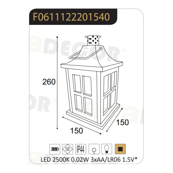 Επιτραπέζιο φωτιστικό-φανάρι της εταιρείας Aca Decor σε vintage στυλ. Είναι κατασκευασμένο από ξύλο σε μπεζ αντικέ απόχρωση και λευκό πλαστικό υλικό με μεταλλικές λεπτομέρειες σε ασημί χρώμα. Διαθέτει προστασία από υγρασία και βαθμό στεγανότητας IP44 και μπορεί να τοποθετηθεί σε οποιονδήποτε χώρο είτε εσωτερικό είτε εξωτερικό. Έχει 1 ενσωματωμένη πλακέτα Led 0,02Watt, λευκού θερμού φωτός (2500K). Έχει διακόπτη On/Off και λειτουργεί με 3 μπαταρίες τύπου ΑΑ/LR06. Τάση: 1,5Volt. Εγγύηση λαμπτήρα 2 χρόνια. Μετά το πέρας της εγγύησης, ενδεχόμενες επισκευές πραγματοποιούνται κατόπιν επικοινωνίας με τo Spitishop. Tο προϊόν θα αποσταλεί στον επίσημο προμηθευτή, ο οποίος καθορίζει και το κόστος επισκευής. Οι μπαταρίες δεν συμπεριλαμβάνονται.