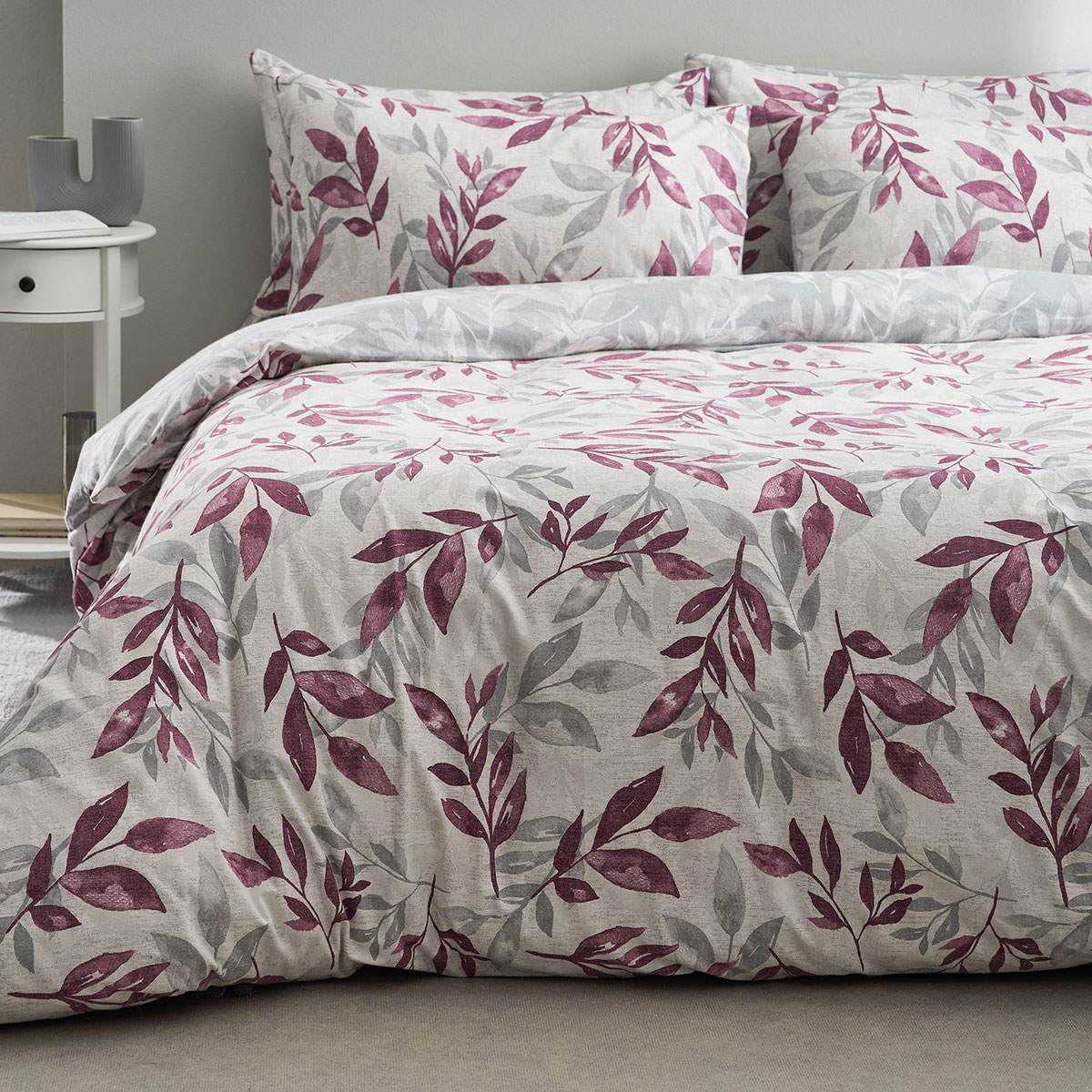 Σετ γίγας φανελένια σεντόνια της εταιρεία Vesta Home. Με γκρι φόντο και φλοράλ σχέδιο σε γκρι-μωβ αποχρώσεις. Το κατωσέντονο είναι γκρι με το ίδιο σχέδιο. Είναι κατασκευασμένα από φανέλα 100% βαμβάκι, απαλά και πολύ ζεστά για τον χειμώνα. Οι μαξιλαροθήκες είναι φάκελος, διπλής όψης αφού από την μια πλευρά έχουν το σχέδιο του πανωσέντονου ενώ η άλλη το σχέδιο του κατωσέντονου. Σε υφασμάτινο πουγκί.