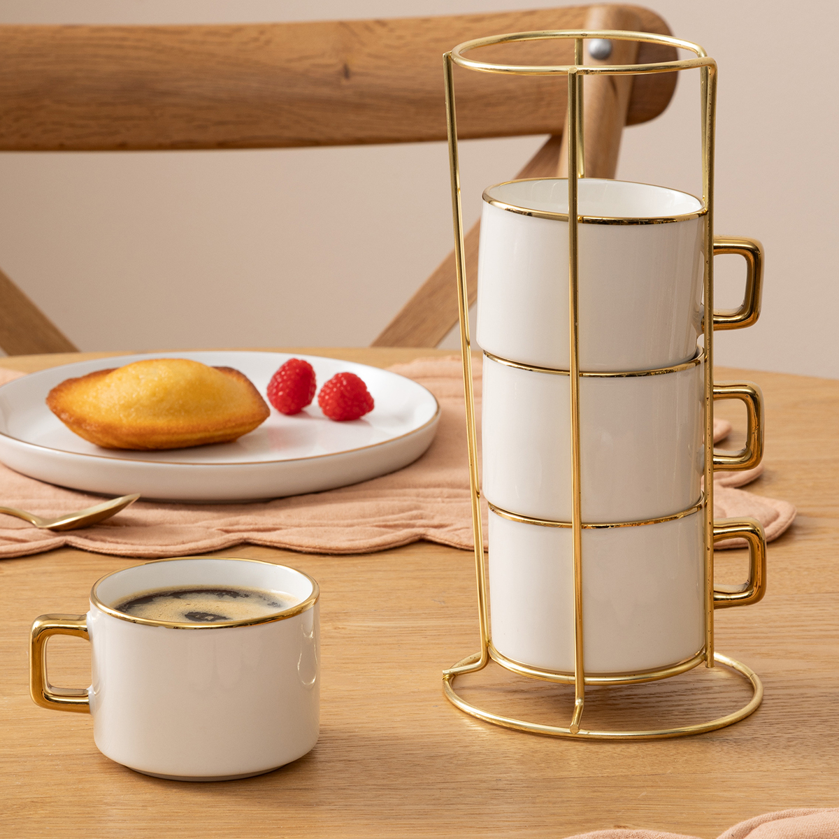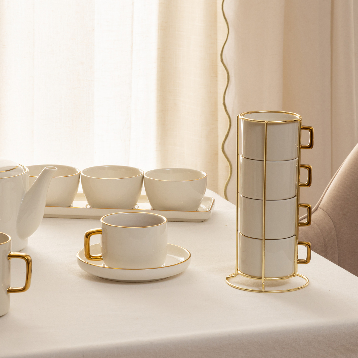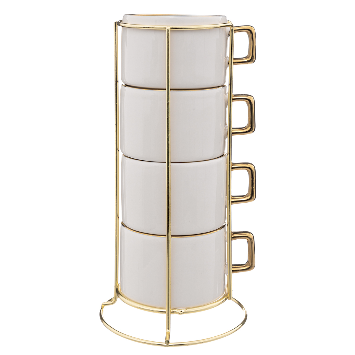 Φλυτζάνια σε σετ 4 τεμαχίων με σταντ για να απολαύσετε τον καφέ σας. Είναι κατασκευασμένα από κεραμικό υλικό σε λευκό χρώμα με χρυσές λεπτομέρειες. Οι κεραμικές κούπες διατηρούν τη θερμοκρασία των ροφημάτων για μεγαλύτερο χρονικό διάστημα, ζεστά ή κρύα, λόγω της καλής θερμομονωτικής τους ικανότητας. Αντέχουν τις υψηλές θερμοκρασίες και είναι ανθεκτικές στις θερμικές αλλαγές. Έρχονται με μεταλλικό σταντ σε χρυσό χρώμα για εύκολη αποθήκευση. Συνδυάστε τις με τα υπόλοιπα προϊόντα του ίδιο σετ για ένα ολοκληρωμένο αποτέλεσμα. Χωρητικότητα 170ml.