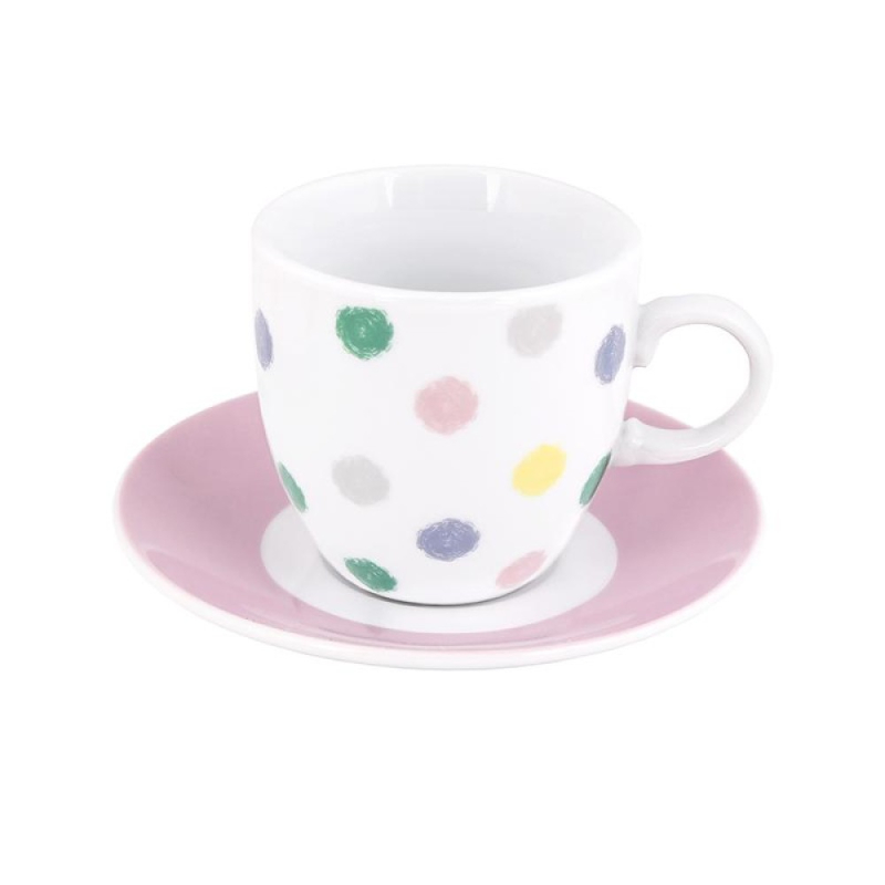 Σετ φλυτζάνια espresso με πιατάκια από την εταιρεία Maxhome σε λευκό χρώμα με πολύχρωμο πουά σχέδιο. Το πιατάκι έχει ροζ χρώμα. Είναι κατασκευασμένα από πορσελάνη. Ιδανικό σετ για να πίνετε τον εσπρέσσο σας ή όποιον άλλον καφέ επιθυμείτε.