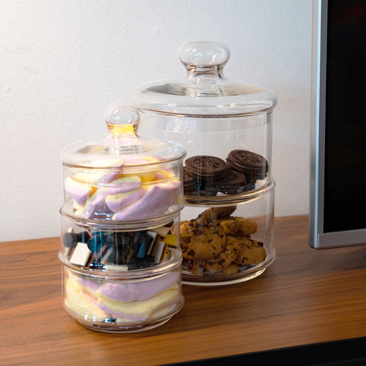 Φοντανιέρα 2 θέσεων με μοντέρνο σχεδιασμό. Είναι κατασκευασμένη από διάφανο γυαλί, κατάλληλο για επαφή με τρόφιμα και έχει γυάλινο καπάκι. Μπορείτε να τοποθετήσετε γλυκά, σοκολατάκια ή ξηρούς καρπούς. Ιδανική για να σερβίρετε με στυλ τους καλεσμένους σας.