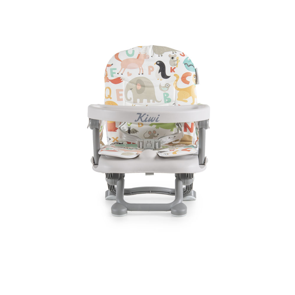Φορητό καθισματάκι φαγητού Kiwi της εταιρείας Cangaroo με λευκό φόντο και πολύχρωμο σχέδιο ζωάκια. Κατάλληλο για παιδιά από 6 έως 36 μηνών ή μέχρι 15kg.
