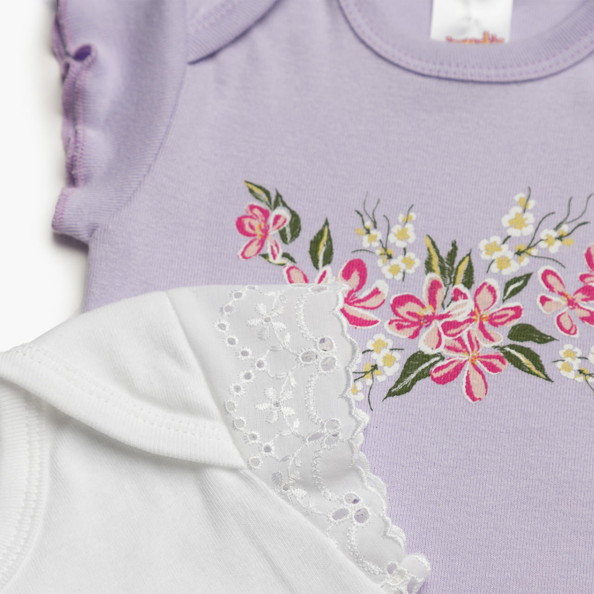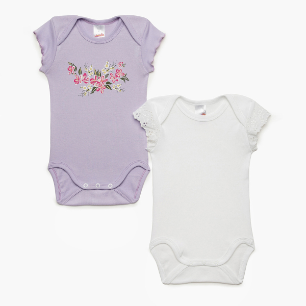 Βρεφικά φορμάκια (κωδ.: 30785) σετ 2 τμχ από τη συλλογή Minervakia της εταιρείας Minerva. Πρόκειται για κοντομάνικα ζιπουνάκια σε ρομαντικό στυλ. Το ένα φορμάκι είναι λευκό μονόχρωμο και φέρει δαντέλα στα μανίκια. Το δεύτερο φορμάκι έχει λιλά απόχρωση και φέρει χαριτωμένο φλοράλ σχέδιο στο στήθος. Είναι κατασκευασμένα από 100% βαμβακερό ύφασμα πεννιέ, που προσδίδει ιδιαίτερη απαλότητα, αντοχή και σωστή εφαρμογή. Δεν διαθέτουν εσωτερικές πλαϊνές ραφές προς αποφυγή ερεθισμών του ευαίσθητου βρεφικού δέρματος. Είναι ιδιαίτερα ανθεκτικά και διατηρούν τη φόρμα τους. Διαθέτουν 3 clips (σούστες) στο κάτω μέρος για εύκολο κλείσιμο και άνοιγμα. Τα φορμάκια φέρουν υφασμάτινη φάσα περιμετρικά στα ποδαράκια για άνετη και σταθερή εφαρμογή. Τα χρώματα και τα σχέδια έχουν δημιουργηθεί με την μέθοδο της νηματοβαφής (μέσα στην ύφανση), με αποτέλεσμα να παραμένουν αναλλοίωτα στην χρήση και τις πλύσεις. Σε όλα τα στάδια παραγωγής έχουν χρησιμοποιηθεί υποαλλεργικά υλικά χωρίς επιβλαβείς ουσίες προς την υγεία. Διαθέτουν τα διεθνή πιστοποιητικά ποιότητας και ασφάλειας ISO 9001:2000 , ISO 9002, Oeko-Tex Standard 100, Eco Textile Label. Αποτελούν προϊόντα ελληνικής ραφής με την εγγύηση ποιότητας και αξιοπιστίας της εταιρείας Minerva. Μεγεθολόγιο ανάλογα με ηλικία, ύψος και βάρος βρέφους: 62cm (1-3 μηνών, 5.5kg), 70cm (3-6 μηνών, 7.5kg), 78cm (6-12 μηνών, 10kg), 86cm (12-18 μηνών, 11.5kg), 92cm (18-24 μηνών, 13kg).