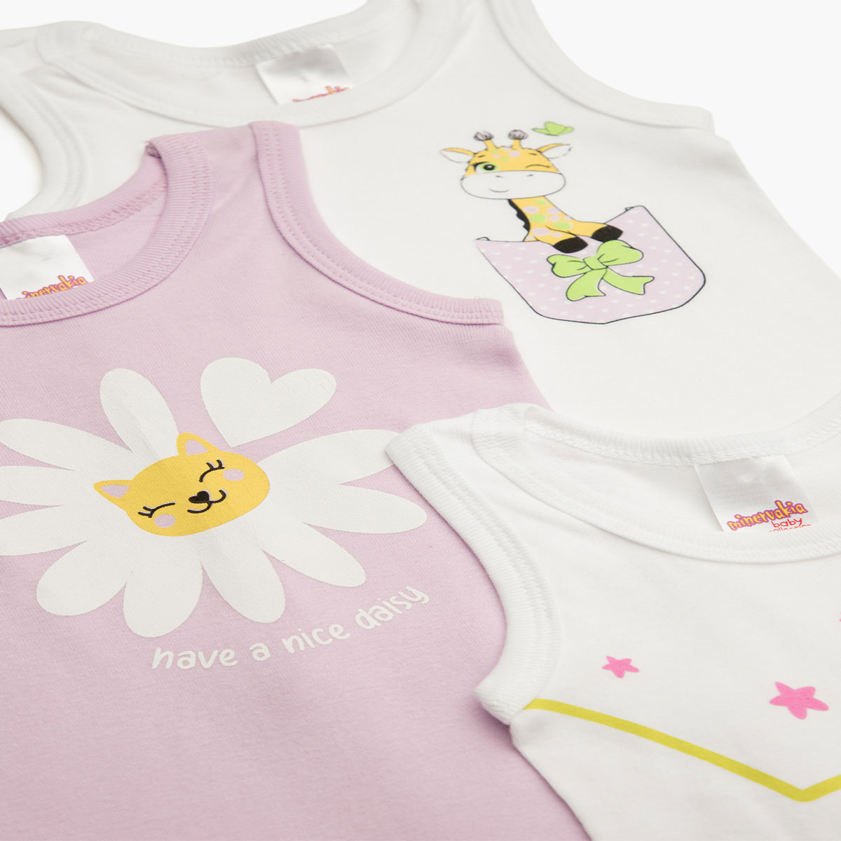 Βρεφικά φορμάκια σετ 3 τεμαχίων από τη συλλογή Minervakia της εταιρείας Minerva. Πρόκειται για κοντομάνικα ζιπουνάκια σε λευκό και λιλά χρώμα με μοντέρνο σχέδιο. Είναι κατασκευασμένα από 100% βαμβακερό ύφασμα, που προσδίδει ιδιαίτερη απαλότητα, αντοχή και σωστή εφαρμογή. Δεν διαθέτουν εσωτερικές πλαϊνές ραφές προς αποφυγή ερεθισμών του ευαίσθητου βρεφικού δέρματος. Είναι ιδιαίτερα ανθεκτικά και διατηρούν τη φόρμα τους. Διαθέτουν 3 clips (σούστες) στο κάτω μέρος για εύκολο κλείσιμο και άνοιγμα. Τα φορμάκια φέρουν υφασμάτινη φάσα περιμετρικά στα ποδαράκια για άνετη και σταθερή εφαρμογή. Τα χρώματα και τα σχέδια έχουν δημιουργηθεί με την μέθοδο της νηματοβαφής (μέσα στην ύφανση), με αποτέλεσμα να παραμένουν αναλλοίωτα στην χρήση και τις πλύσεις. Σε όλα τα στάδια παραγωγής έχουν χρησιμοποιηθεί υποαλλεργικά υλικά χωρίς επιβλαβείς ουσίες προς την υγεία. Διαθέτουν τα διεθνή πιστοποιητικά ποιότητας και ασφάλειας ISO 9001:2000 , ISO 9002, Oeko-Tex Standard 100, Eco Textile Label. Αποτελούν προϊόντα ελληνικής ραφής με την εγγύηση ποιότητας και αξιοπιστίας της εταιρείας Minerva. Μεγεθολόγιο ανάλογα με ηλικία, ύψος και βάρος βρέφους: 62cm (1-3 μηνών, 5.5kg), 70cm (3-6 μηνών, 7.5kg), 78cm (6-12 μηνών, 10kg), 86cm (12-18 μηνών, 11.5kg), 92cm (18-24 μηνών, 13kg).