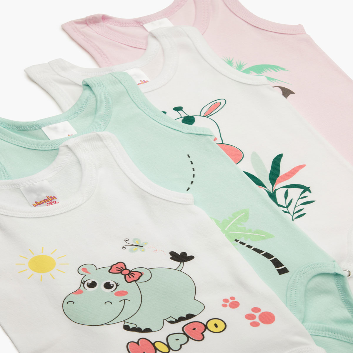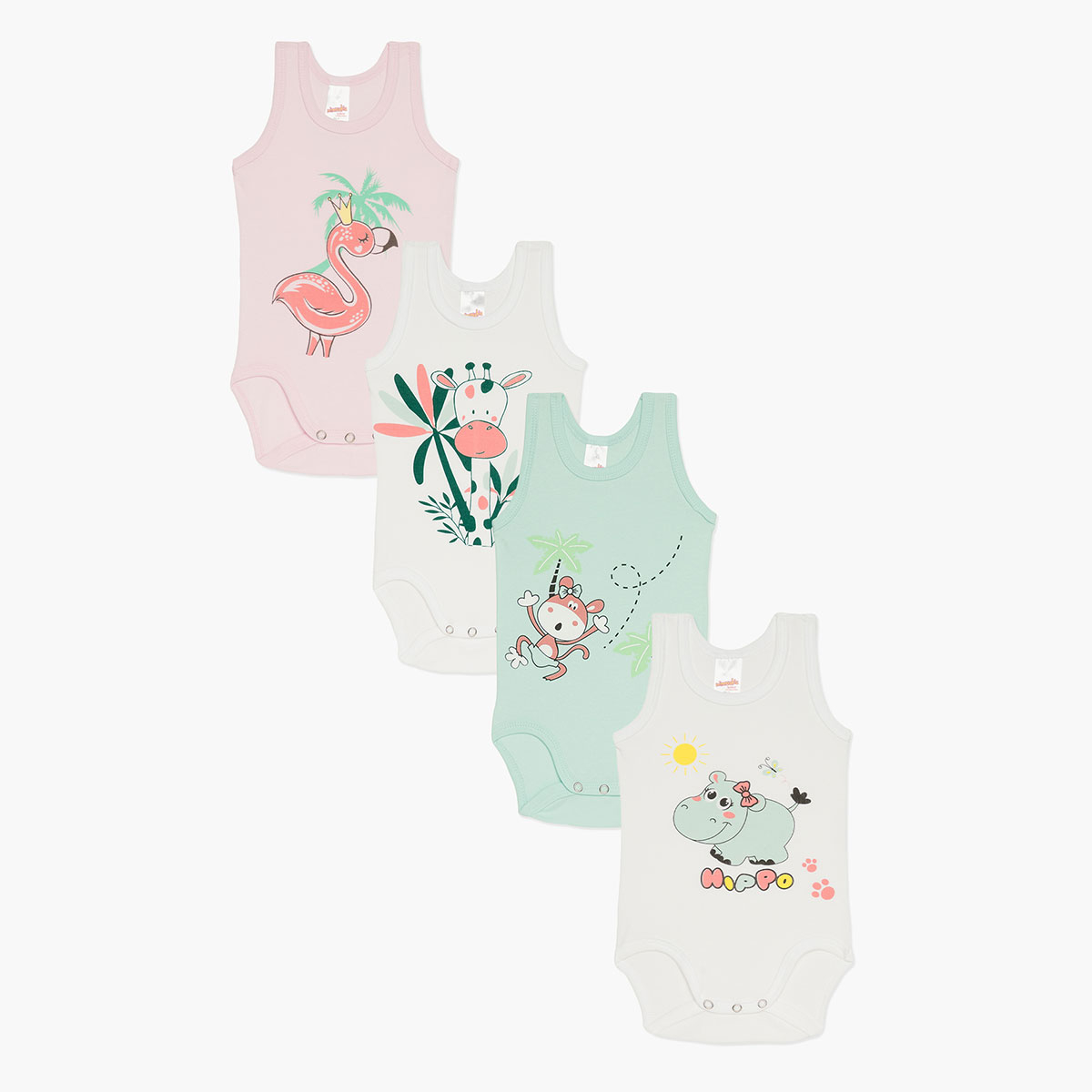 Βρεφικά φορμάκια σετ 4 τεμαχίων από τη συλλογή Minervakia της εταιρείας Minerva. Πρόκειται για κοντομάνικα ζιπουνάκια σε λευκό, ροζ και βεραμάν χρώμα με ζωάκια στο σχέδιο. Είναι κατασκευασμένα από 100% βαμβακερό ύφασμα, που προσδίδει ιδιαίτερη απαλότητα, αντοχή και σωστή εφαρμογή. Δεν διαθέτουν εσωτερικές πλαϊνές ραφές προς αποφυγή ερεθισμών του ευαίσθητου βρεφικού δέρματος. Είναι ιδιαίτερα ανθεκτικά και διατηρούν τη φόρμα τους. Διαθέτουν 3 clips (σούστες) στο κάτω μέρος για εύκολο κλείσιμο και άνοιγμα. Τα φορμάκια φέρουν υφασμάτινη φάσα περιμετρικά στα ποδαράκια για άνετη και σταθερή εφαρμογή. Τα χρώματα και τα σχέδια έχουν δημιουργηθεί με την μέθοδο της νηματοβαφής (μέσα στην ύφανση), με αποτέλεσμα να παραμένουν αναλλοίωτα στην χρήση και τις πλύσεις. Σε όλα τα στάδια παραγωγής έχουν χρησιμοποιηθεί υποαλλεργικά υλικά χωρίς επιβλαβείς ουσίες προς την υγεία. Διαθέτουν τα διεθνή πιστοποιητικά ποιότητας και ασφάλειας ISO 9001:2000 , ISO 9002, Oeko-Tex Standard 100, Eco Textile Label. Αποτελούν προϊόντα ελληνικής ραφής με την εγγύηση ποιότητας και αξιοπιστίας της εταιρείας Minerva. Μεγεθολόγιο ανάλογα με ηλικία, ύψος και βάρος βρέφους: 62cm (1-3 μηνών, 5.5kg), 70cm (3-6 μηνών, 7.5kg), 78cm (6-12 μηνών, 10kg), 86cm (12-18 μηνών, 11.5kg), 92cm (18-24 μηνών, 13kg).