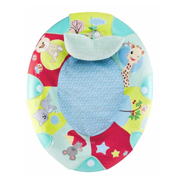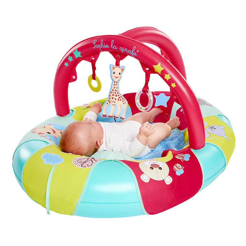 Εκπαιδευτικό γυμναστήριο με την αγαπημένη Σόφι την καμηλοπάρδαλη. Το στρώμα και το τόξο είναι φουσκωτά που το καθιστά πολύ πρακτικό και εύκολο για μεταφορά. Μπορεί να χρησιμοποιηθεί σε 3 θέσεις: -Αφαιρώντας το τόξο το μωρό μπορεί να παίζει καθώς είναι προστατευμένο από τα πλευρικά τοιχώματα. -Από 3 μηνών, σε ξαπλωμένη θέση, το μωρό μπορεί να ανακαλύψεις τις δραστηριότητες του γυμναστηρίου. -Καθώς το μωρό μεγαλώνει και είναι ικανό να κάθεται μόνο, ανακαλύπτει τις δραστηριότητων που υπάρχουν στον αφαιρούμενο πίνακα. Στη συσκευασία περιλαμβάνεται ένα μαξιλάρι για να είναι άνετο το μωρό όταν είναι ξαπλωμένο ή να στηρίζει την πλατούλα του όταν είναι καθιστό. Κατάλληλο για βρέφη 0 μηνών και άνω.