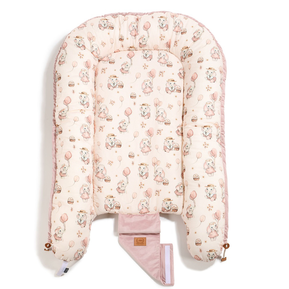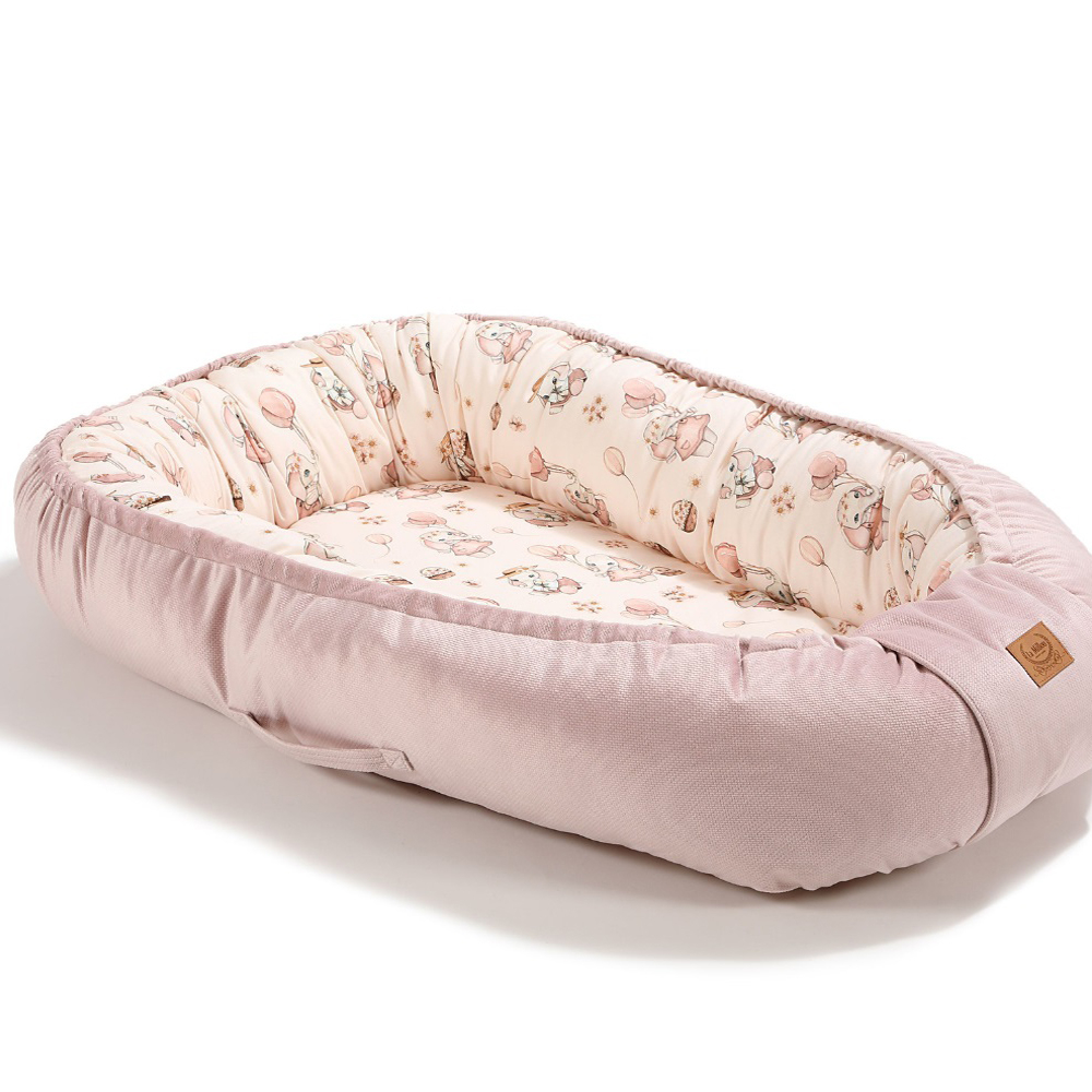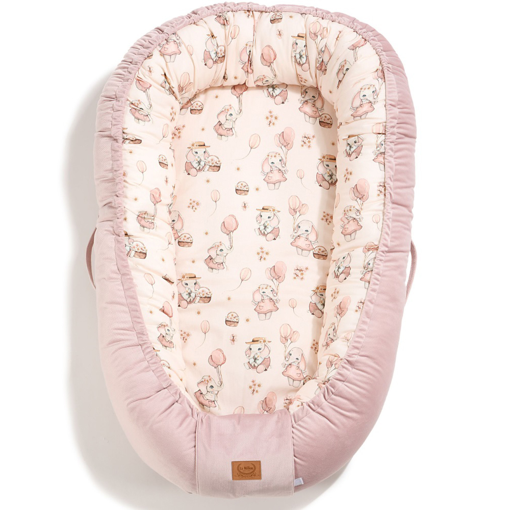 Φωλιά ύπνου της εταιρείας La Millou. Βοηθάει το μωρό σας να χαλαρώσει καθώς το αγκαλιάζει και το κάνει να νιώθει ασφαλές και προστατευμένο. Προστατεύει από τα χτυπήματα, τις απότομες κινήσεις αλλά και όταν γυρνάει πλευρό. Μπορείτε να την έχετε πάντα και παντού μαζί σας για να ξεκουραστεί το μωρό σας νιώθοντας ασφάλεια. Είναι κατάλληλη από την πρώτη ημέρα της γέννησης και για ολόκληρο τον πρώτο χρόνο. Διαθέτει κορδόνια, καλυμμένα από βελουτέ ύφασμα που δεν μπλέκονται στα πόδια του μωρού και προσαρμόζουν το μέγεθος της φωλιάς. Τοποθετούνται εύκολα μέσα στην ειδική περιμετρική θήκη για να μην εξέχουν προσφέροντας επιπλέον ασφάλεια. Έχει βελουτέ χερούλια για να την μεταφέρετε εύκολα (δεν μπορεί να χρησιμοποιηθεί για να μεταφέρετε το μωρό) .Το εσωτερικό της ύφασμα είναι από 100% βαμβάκι σε εκρού χρώμα, με σχέδιο ελεφαντάκια και ροζ λεπτομέρειες. Το εξωτερικό της ύφασμα είναι elegant-Velvet σε ροζ απόχρωση. Το εσωτερικό στρώμα είναι φτιαγμένο από χνούδι σιλικόνης. Πλένεται στο πλυντήριο χωρίς να χρειάζεται να αφαιρεθεί το στρώμα, καθώς το εσωτερικό γέμισμα είναι ραμμένο με το εξωτερικό βαμβακερό ύφασμα. Περιλαμβάνεται η τσάντα μεταφοράς. Τα υφάσματα και η εσωτερική γέμιση έχουν πιστοποίηση Oeko – Tex Standard 100. Συνιστάται η επίβλεψη του γονέα τουλάχιστον μέχρι την ηλικία των 12 μηνών. Όλα τα προϊόντα της εταιρείας La Millou είναι χειροποίητα. Συνδυάστε την με τα υπόλοιπα είδη της ίδιας σειράς για ένα ολοκληρωμένο αποτέλεσμα.