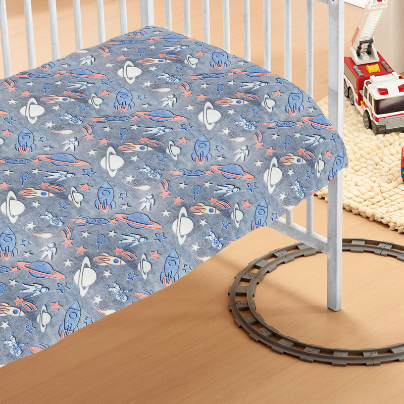Κουβέρτα φλις για την κούνια του μωρού σας σε μπλε χρώμα, με λευκές-κόκκινες λεπτομέρειες και σχέδιο διάστημα από την εταιρεία Dimcol. Κατασκευασμένη από 100% polyester βάρους 240gsm που την καθιστά πολύ μαλακή και απαλή υφή. Τα ανάγλυφα σχέδια της φωσφορίζουν στο σκοτάδι. Ιδανικό σκέπασμα για τους χειμερινούς μήνες.