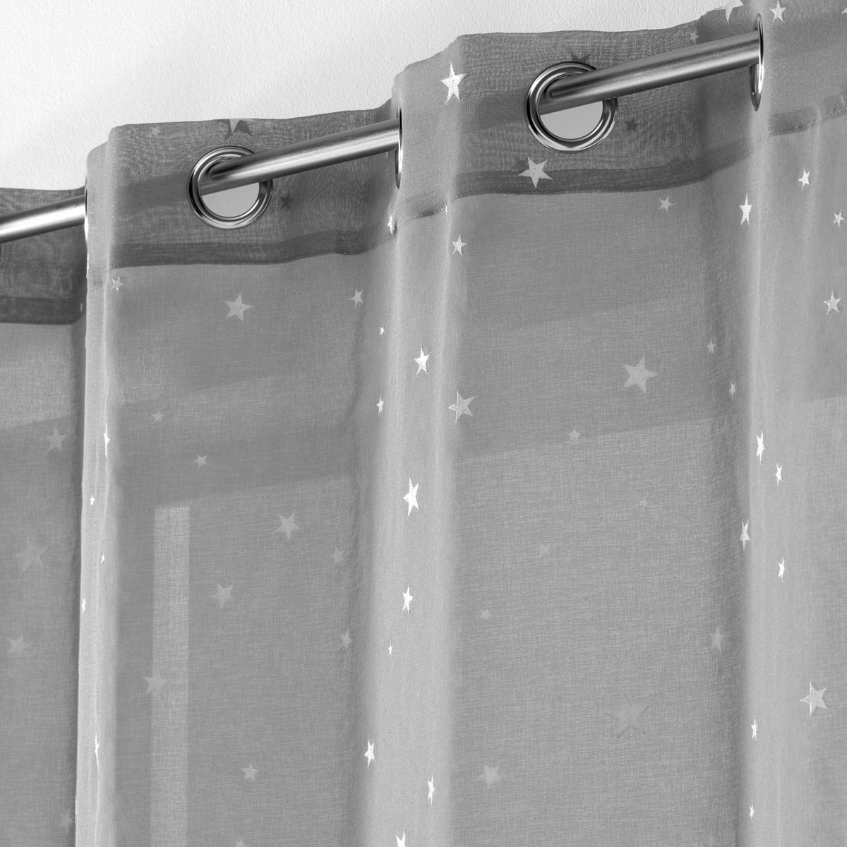 Παιδική κουρτίνα σε γκρι απόχρωση με αστεράκια που φωσφορίζουν στο σκοτάδι. Το ύφασμα είναι βουάλ 100% πολυεστερικό με χαμηλή σκίαση, που επιτρέπει στο φως να περνάει. Στο επάνω μέρος διαθέτει τρουκς κρεμάσματος με διάμετρο 4cm για εύκολη τοποθέτηση. Κρεμάστε την και διακοσμήστε με τον πιο εύκολο τρόπο το παιδικό ή βρεφικό δωμάτιο.