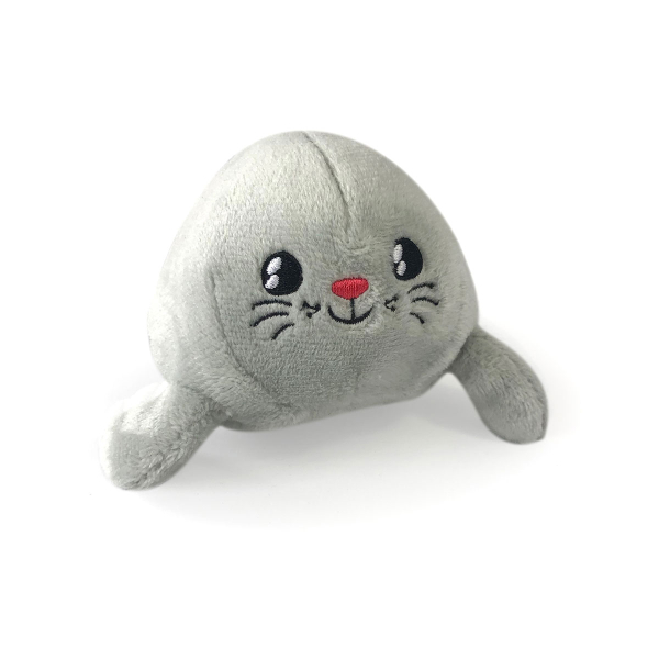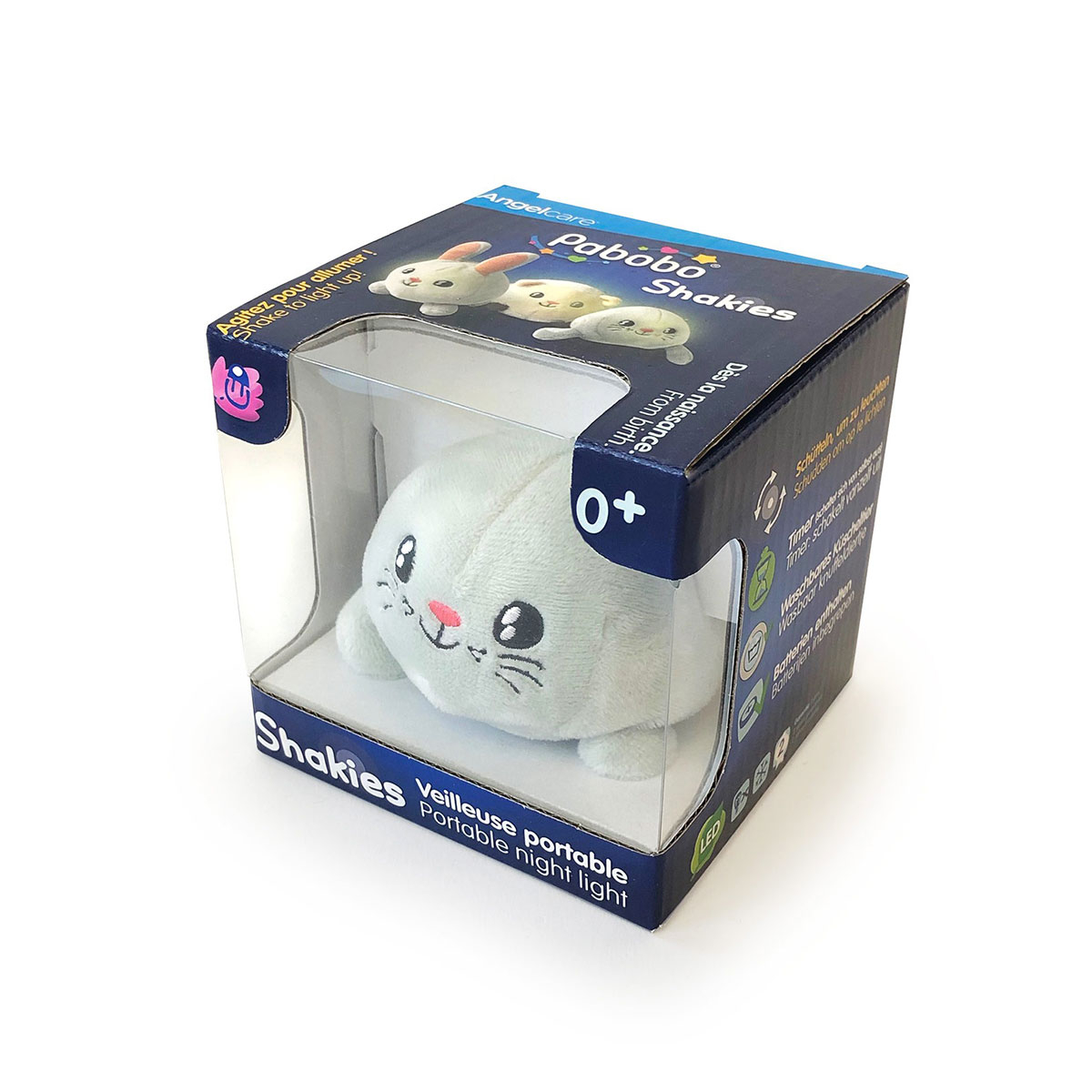 Φωτεινός αγκαλίτσας της εταιρείας Pabobo σε σχήμα φώκιας με γκρι χρώμα. Ανακινήστε το και το χαριτωμένο μαλακό παιχνίδι για να ανάψει. Είναι βελούδινο πολύ απαλό με κεντημένα ανοιχτά μάτια. Έχει πολύ απαλό LED φως και δεν θερμαίνεται ούτε κάτω από τα σεντόνια. Σταματάει αυτόματα μετά από 5 δευτερόλεπτα ή 5 λεπτά. Το υφασμάτινο κουνελάκι μπορεί να αφαιρεθεί από τον προβολέα και να πλυθεί εύκολα στο πλυντήριο. Είναι εγκεκριμένο από την Ecologic Agency. Λειτουργεί με 1 μπαταρία που περιλαμβάνεται.