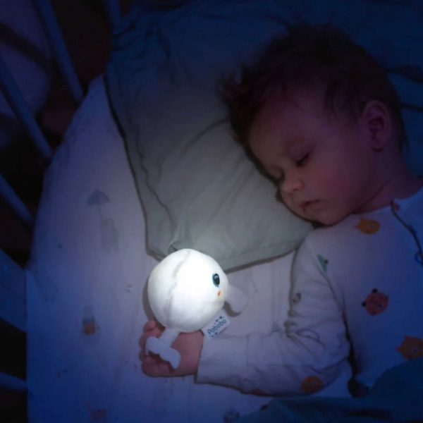 Φωτεινός αγκαλίτσας της εταιρείας Pabobo σε σχήμα φάλαινας με λευκό χρώμα. Ανακινήστε το και το χαριτωμένο μαλακό παιχνίδι για να ανάψει. Είναι βελούδινο πολύ απαλό με κεντημένα ανοιχτά μάτια. Έχει πολύ απαλό LED φως και δεν θερμαίνεται ούτε κάτω από τα σεντόνια. Σταματάει αυτόματα μετά από 5 δευτερόλεπτα ή 5 λεπτά. Το υφασμάτινο κουνελάκι μπορεί να αφαιρεθεί από τον προβολέα και να πλυθεί εύκολα στο πλυντήριο. Είναι εγκεκριμένο από την Ecologic Agency. Λειτουργεί με 1 μπαταρία που περιλαμβάνεται.
