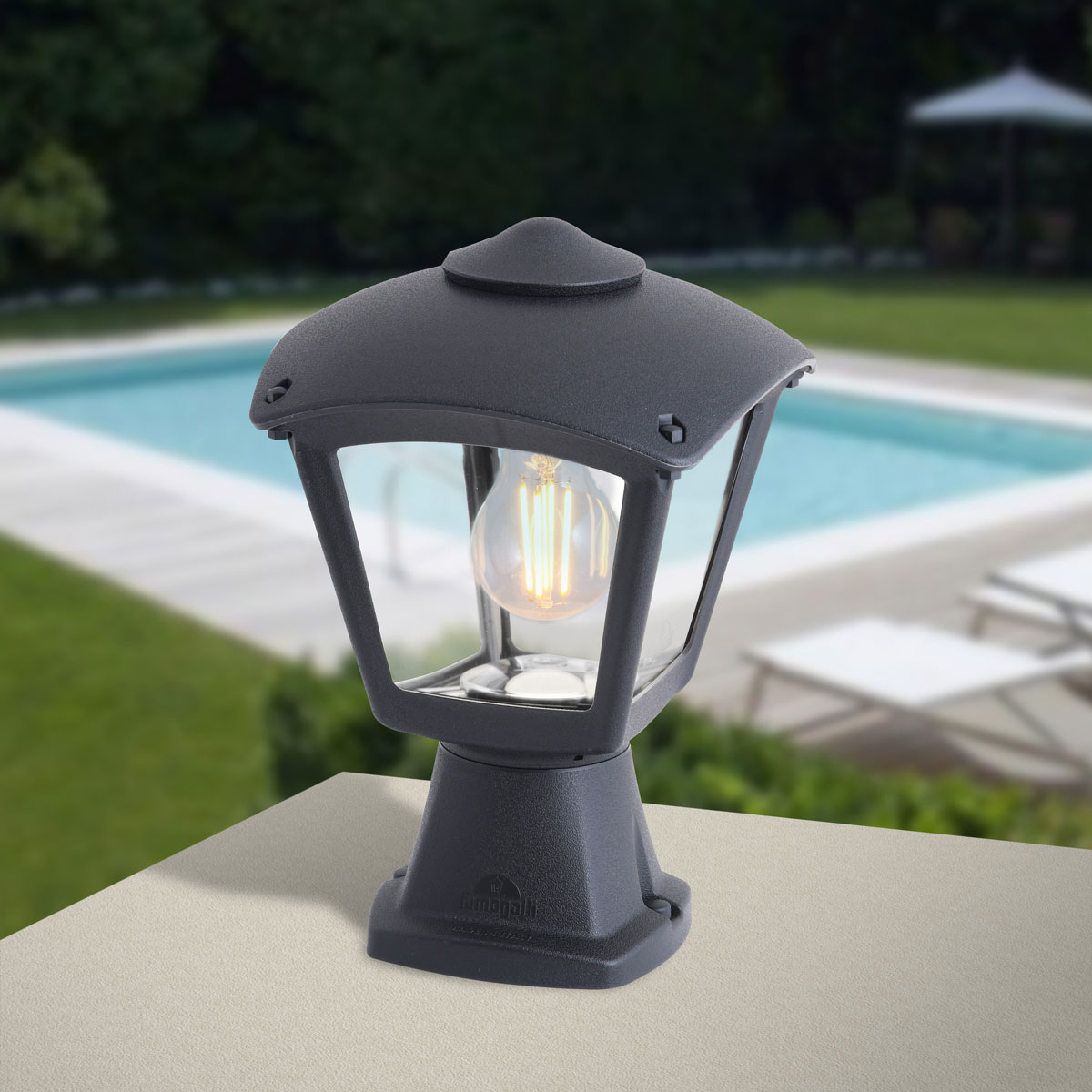 Επιδαπέδιο φανάρι εξωτερικού χώρου της ιταλικής εταιρείας Fumagalli με vintage σχεδιασμό. Είναι κατασκευασμένο από ρητίνη σε μαύρο χρώμα. Έχει προστατευτικό κάλυμμα από plexiglass. Διαθέτει προστασία από υγρασία και σκόνη με βαθμό στεγανότητας IP55 που το καθιστά κατάλληλο για εξωτερικούς χώρους. Τύπος ντουί: 1xE27 και θέση για ένα λαμπτήρα έως 8.5W. Τα φωτιστικά από ρητίνη της ιταλικής εταιρείας Fumagalli έχουν αντιδιαβρωτική προστασία, δεν χρειάζονται συντήρηση και έχουν διπλή μόνωση. Δεν σκουριάζουν και είναι ανθεκτικά στα χημικά λιπάσματα και στην υπέρυθρη ακτινοβολία. Εγγύηση 2 χρόνια. Περιλαμβάνονται οι βίδες στερέωσης. **Ο λαμπτήρας δεν συμπεριλαμβάνεται.**