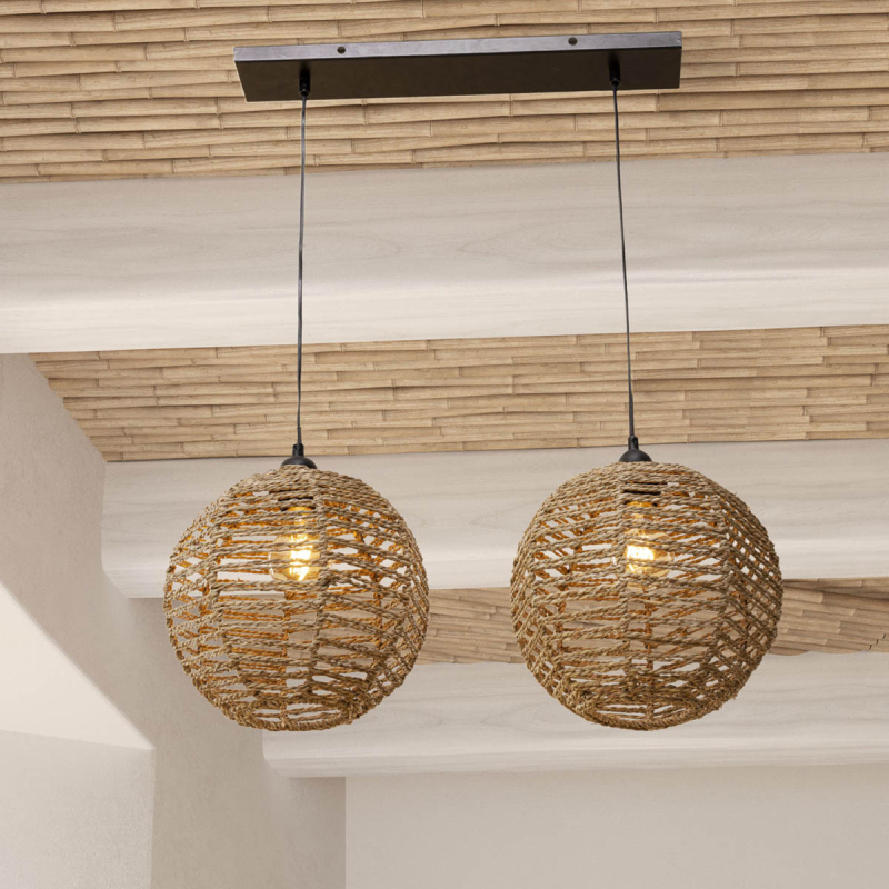 Φωτιστικό οροφής με ράγα σε μοντέρνο στυλ. Ο σκελετός και η βάση τοποθέτησης είναι μεταλλικά σε μαύρο χρώμα. Έχει 2 καπέλα που είναι κατασκευασμένα από φυσική ψάθα σε μπεζ απόχρωση. Υπάρχει δυνατότητα αυξομείωσης του συνολικού ύψους μέσω των 2 μαύρων καλωδίων ανάρτησης. Τύπος ντουί: 2xE27 και θέσεις για 2 λαμπτήρες έως 40W (δεν συμπεριλαμβάνονται).