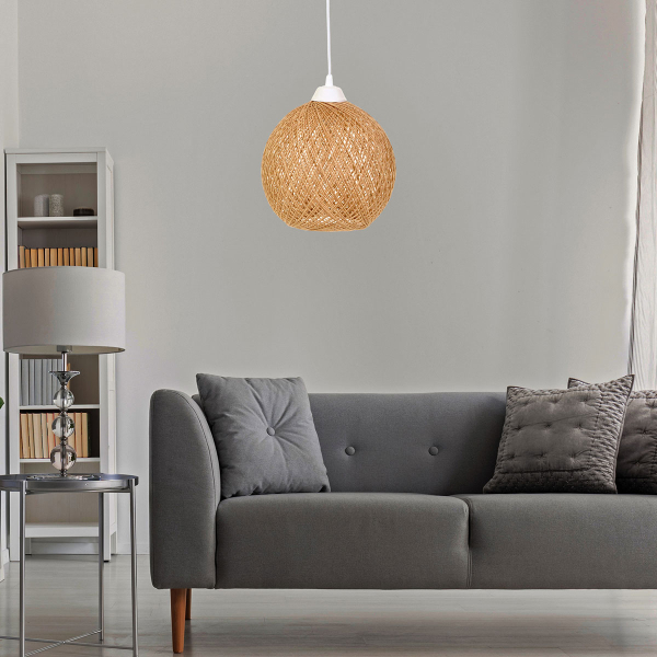 Φωτιστικό οροφής μπάλα σε μοντέρνο στυλ. Είναι κατασκευασμένο από ψάθα jute σε καφέ χρώμα. Υπάρχει δυνατότητα αυξομείωσης του συνολικού ύψους έως μέσω του λευκού καλωδίου μήκους 55εκ. μέσω του καλωδίου ανάρτησης. Τύπος ντουί: 1xE27 και θέση για 1 λαμπτήρα έως 40W (δεν συμπεριλαμβάνεται).