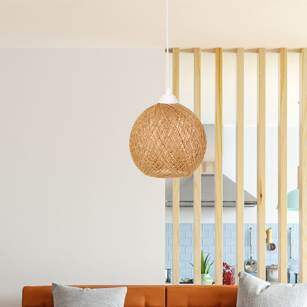 Φωτιστικό οροφής μπάλα σε μοντέρνο στυλ. Είναι κατασκευασμένο από ψάθα jute σε μπεζ και λιλά χρώμα. Υπάρχει δυνατότητα αυξομείωσης του συνολικού ύψους έως 55εκ. μέσω του καλωδίου ανάρτησης. Τύπος ντουί: 1xE27 και θέση για 1 λαμπτήρα έως 40W (δεν συμπεριλαμβάνεται).