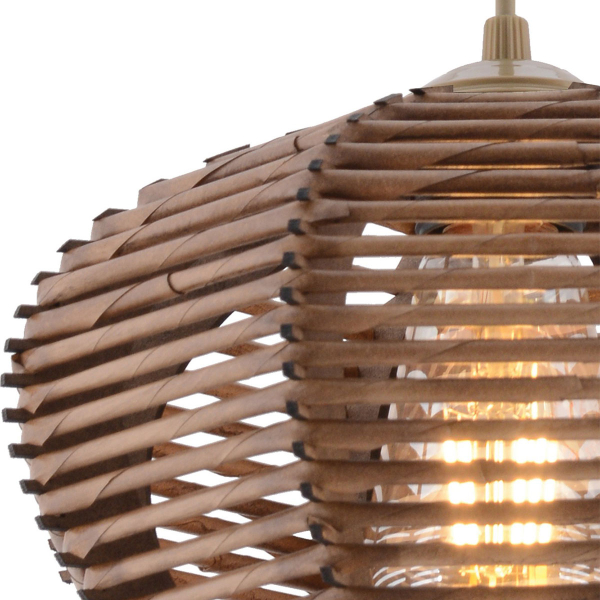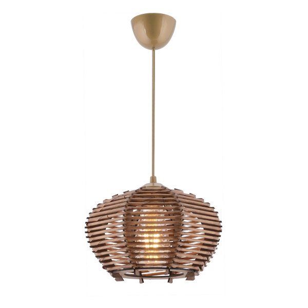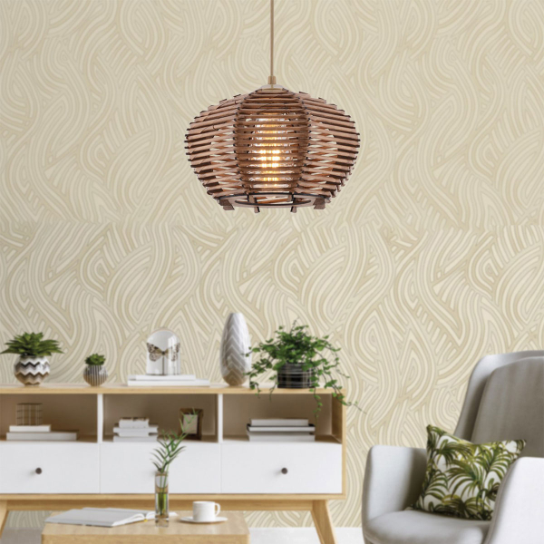 Φωτιστικό οροφής σε μοντέρνο στυλ σε καφέ απόχρωση. Είναι κατασκευασμένο από ξύλο και τεχνητό bamboo. Υπάρχει δυνατότητα αυξομείωσης του συνολικού ύψους έως 55εκ. μέσω του καλωδίου ανάρτησης. Τύπος ντουί: 1xE27 και θέση για 1 λαμπτήρα έως 40W (δεν συμπεριλαμβάνεται).