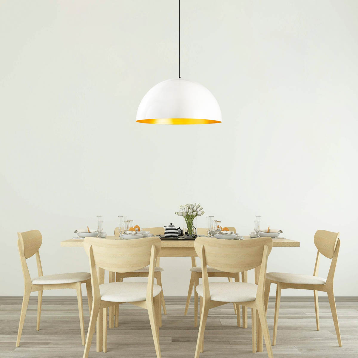 Φωτιστικό οροφής με μίνιμαλ σχεδιασμό και γυαλιστερό φινίρισμα. Είναι κατασκευασμένο από μεταλλικό υλικό σε λευκό χρώμα με χρυσό στο εσωτερικό του καπέλου. Υπάρχει δυνατότητα αυξομείωσης του συνολικού ύψους έως 126εκ. μέσω του καλωδίου ανάρτησης. Τύπος ντουί: 1xE27 και θέση για 1 λαμπτήρα έως 40W (δεν συμπεριλαμβάνεται).