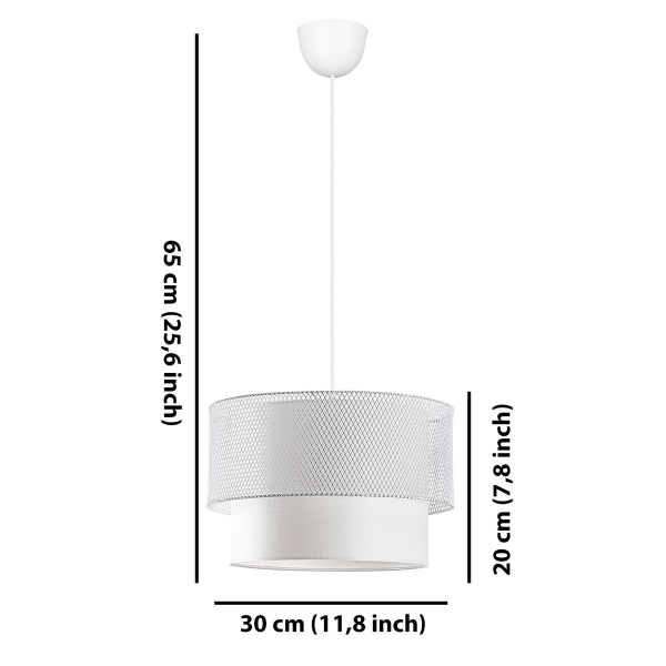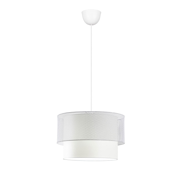 Φωτιστικό οροφής σε μοντέρνο στυλ σε λευκό χρώμα, με μεταλλικό πλέγμα εξωτερικά. Υπάρχει δυνατότητα αυξομείωσης του συνολικού ύψους έως 65εκ. μέσω του καλωδίου ανάρτησης. Τύπος ντουί: 1xE27 και θέση για 1 λαμπτήρα έως 40W (δεν συμπεριλαμβάνεται).