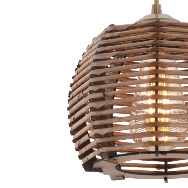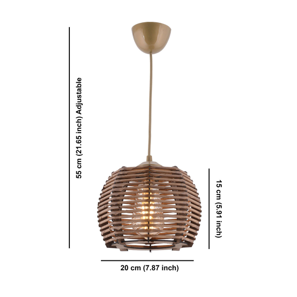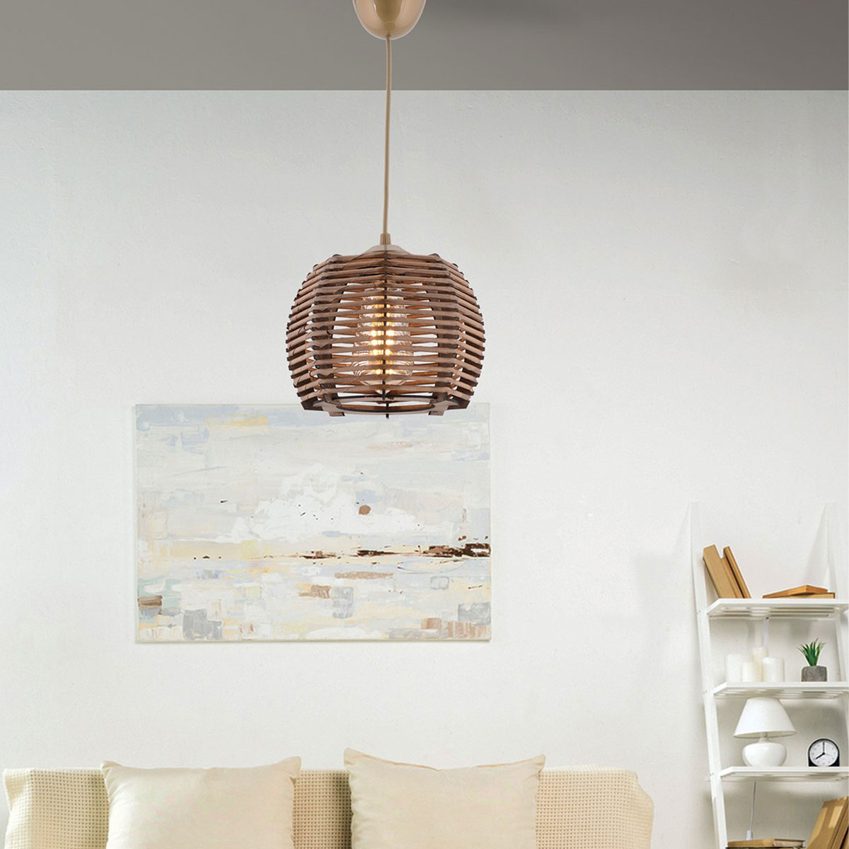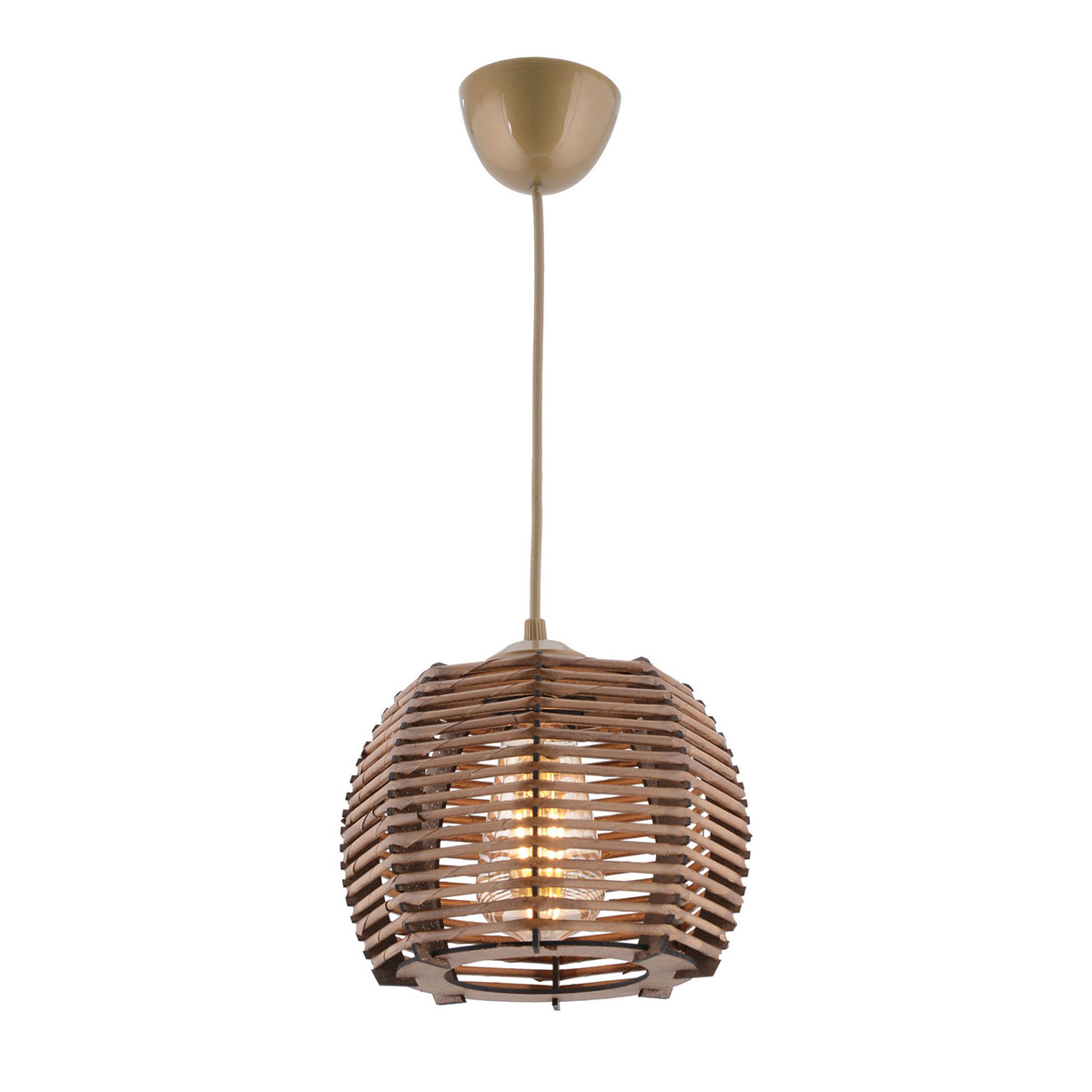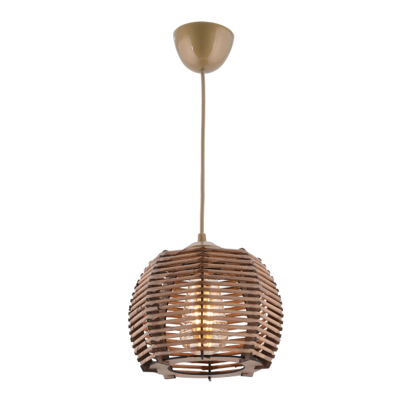 Φωτιστικό οροφής με μοντέρνο σχεδιασμό σε καφέ απόχρωση. Ο σκελετός του είναι ξύλινος με επένδυση από τεχνητό bamboo. Υπάρχει δυνατότητα αυξομείωσης του συνολικού ύψους έως 55εκ. μέσω του καλωδίου ανάρτησης. Τύπος ντουί: 1xE27 και θέση για 1 λαμπτήρα έως 40W (δεν συμπεριλαμβάνεται).