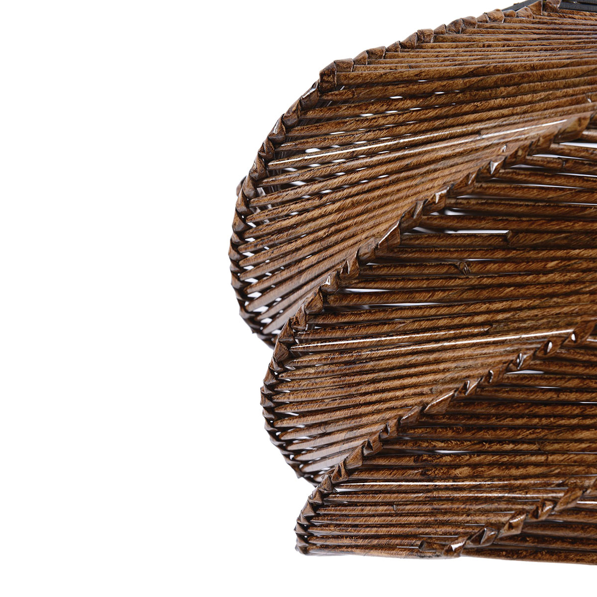 Φωτιστικό οροφής με μοντέρνο στυλ σε καφέ χρώμα. Ο σκελετός του είναι κατασκευασμένος από ξύλο και έχει επένδυση από τεχνητό bamboo. Υπάρχει δυνατότητα αυξομείωσης του συνολικού ύψους έως 65εκ. μέσω του καλωδίου ανάρτησης. Τύπος ντουί: 1xE27 και θέση για 1 λαμπτήρα έως 40W (δεν συμπεριλαμβάνεται).