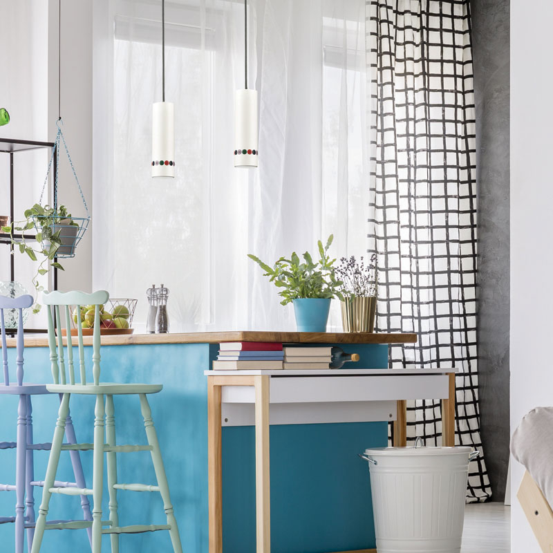 Φωτιστικό οροφής της εταιρείας Aca Decor σε μοντέρνο στυλ. Έχει κεφαλή από αλουμίνιο σε λευκό χρώμα, με πολύχρωμα διακοσμητικά κουμπιά. Υπάρχει δυνατότητα αυξομείωσης του συνολικού ύψους έως 140εκ. μέσω του μαύρου υφασμάτινου καλωδίου. Διαθέτει λευκή μεταλλική βάση τοποθέτησης. Τύπος ντουί: 1xGU10 και θέση για 1 λαμπτήρα έως 35W (δεν συμπεριλαμβάνεται).