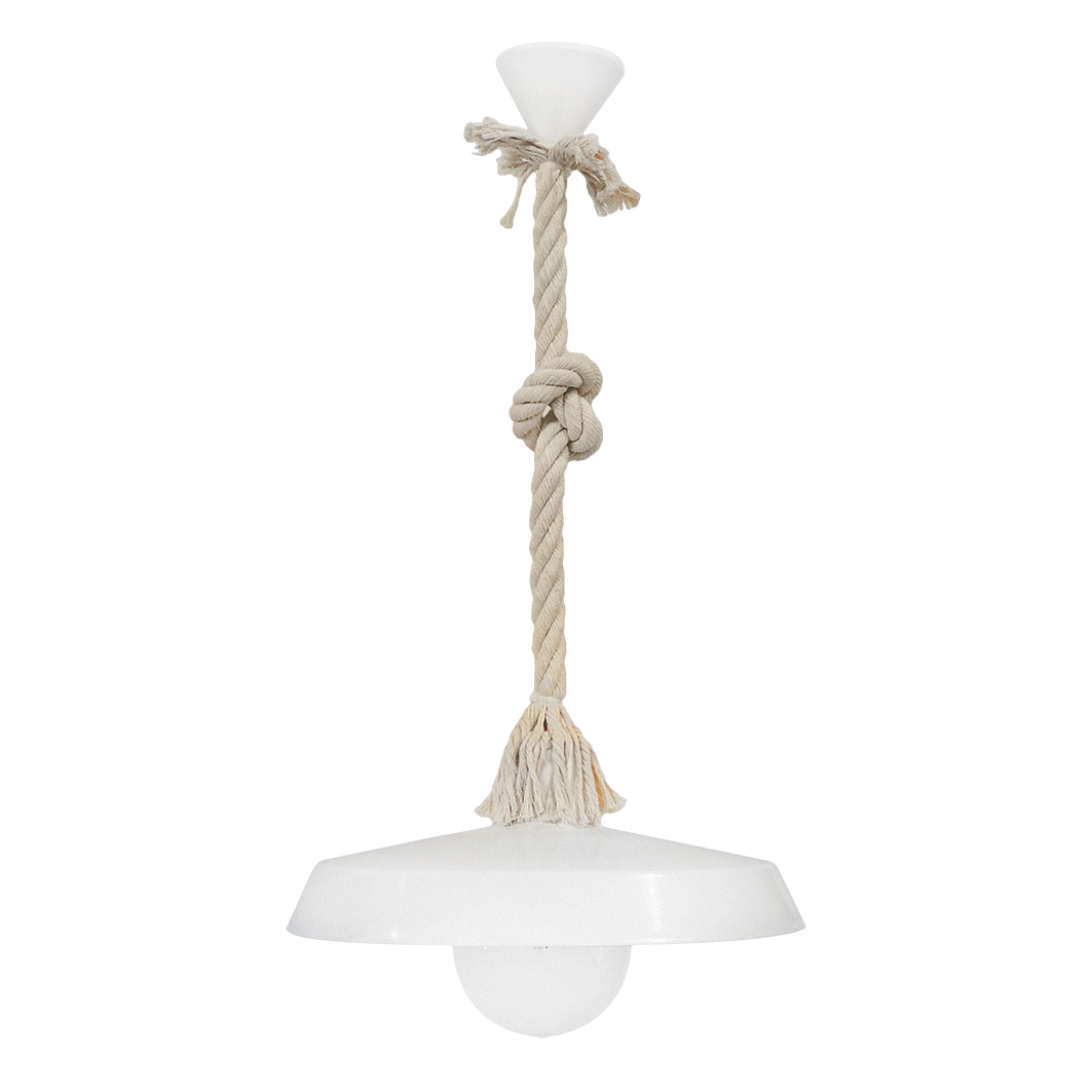 Φωτιστικό οροφής της εταιρείας Heronia σε μοντέρνο στυλ. Είναι κατασκευασμένο από πλαστικό υλικό σε λευκό χρώμα. Φέρει βαμβακερό διακοσμητικό σχοινί με κόμπο σε φυσική εκρού απόχρωση. Διαθέτει βάση τοποθέτησης και καλώδιο σε λευκό χρώμα. Τύπος ντουί: 1xE27 και θέση για 1 λαμπτήρα **ΑΠΟΚΛΕΙΣΤΙΚΑ LED έως 10W** (δεν συμπεριλαμβάνεται). Δεν περιλαμβάνονται οι βίδες στερέωσης.