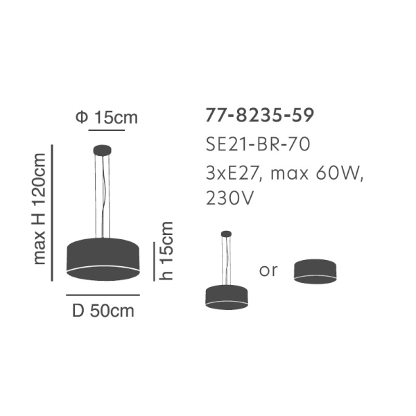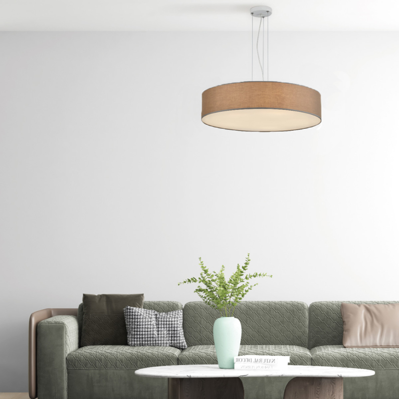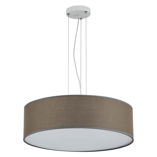Φωτιστικό οροφής της εταιρείας Homelighting σε μοντέρνο στυλ. Μπορεί να τοποθετηθεί και σαν πλαφονιέρα απευθείας στην οροφή. Το καπέλο είναι υφασμάτινο σε καφέ απόχρωση. Στο κάτω μέρος έχει λευκό ματ κάλυμμα από plexiglass. Μπορείτε να ρυθμίσετε το ύψος του φωτιστικού έως και 120εκ. μέσω του καλωδίου και των συρμάτινων αναρτήσεων. Τύπος ντουί: 3xE27 και θέσεις για 3 λαμπτήρες έως 60W έκαστος (δεν συμπεριλαμβάνονται). Τάση: 230Volt.
