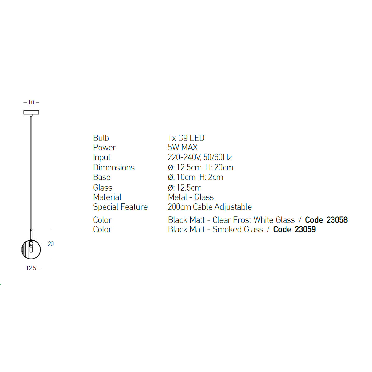 Φωτιστικό οροφής της εταιρείας Zambelis σε μοντέρνο στυλ. Το καπέλο είναι κατασκευασμένο από διάφανο γυαλί με frosted εφέ. Υπάρχει δυνατότητα αυξομείωσης του συνολικού ύψους έως 222εκ. μέσω της ανάρτησης. Τύπος ντουί: 1xG9 και θέση για 1 λαμπτήρα Led έως 5W (δεν συμπεριλαμβάνεται). Τάση: 220-240Volt.