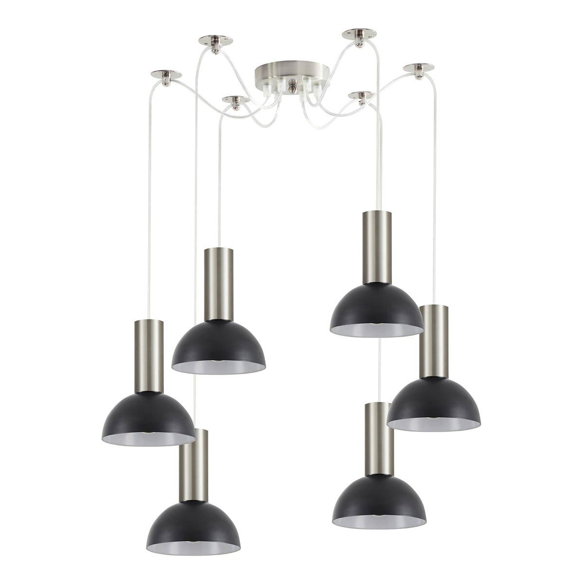 Φωτιστικό οροφής της εταιρείας Homelighting σε μοντέρνο στυλ. Είναι κατασκευασμένο από μέταλλο σε ασημί απόχρωση με 6 μεταλλικά μαύρα καπέλα. Μπορείτε να ρυθμίσετε το ύψος και το σχήμα του φωτιστικού μέσω των καλωδίων και των στηριγμάτων οροφής. Η βάση τοποθέτησης είναι ασημί μεταλλική. Τύπος ντουί: 6xE27 και θέσεις για 6 λαμπτήρες έως 60W έκαστος (δεν συμπεριλαμβάνονται). Τάση: 230Volt.