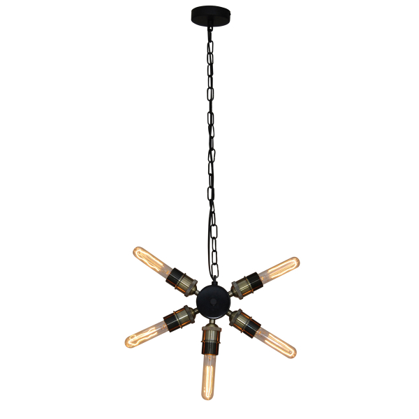 Φωτιστικό οροφής της εταιρείας Homelighting σε βιομηχανικό στυλ. Είναι κατασκευασμένο από μέταλλο σε μαύρο ματ χρώμα. Αποτελείται από αλυσίδα και έναν κεντρικό μεταλλικό βραχίονα, ο οποίος καταλήγει σε 9 μεταλλικά ντουί. Υπάρχει δυνατότητα αυξομείωσης του συνολικού ύψους έως 120εκ. μέσω του μαύρου καλωδίου ανάρτησης και της αλυσίδας. Η βάση τοποθέτησης είναι μαύρη μεταλλική. Τύπος ντουί: 9xE27 και θέσεις για 9 λαμπτήρες έως 60W έκαστος (δεν συμπεριλαμβάνονται). Τάση: 230Volt.