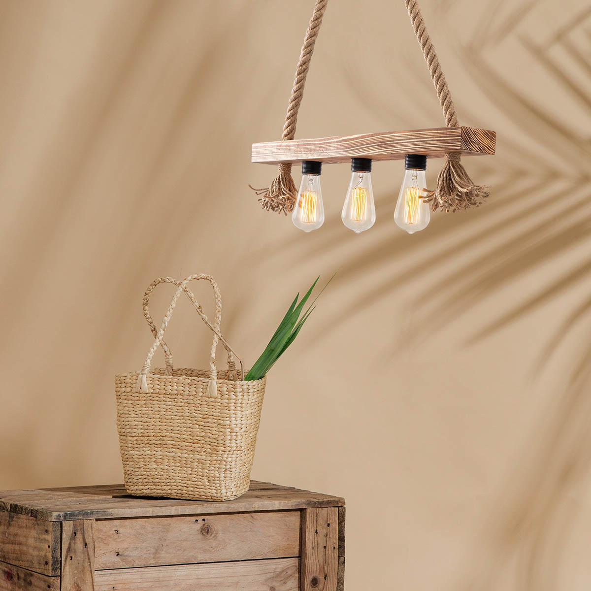 Φωτιστικό οροφής με ράγα και μοντέρνο σχεδιασμό. Είναι κατασκευασμένο από ξύλο και σκοινί σε φυσική απόχρωση. Το ύψος του φωτιστικού μένει σταθερό. Τύπος ντουί: 3xE27 και θέσεις για 3 λαμπτήρες έως 40W έκαστος (δεν συμπεριλαμβάνονται).