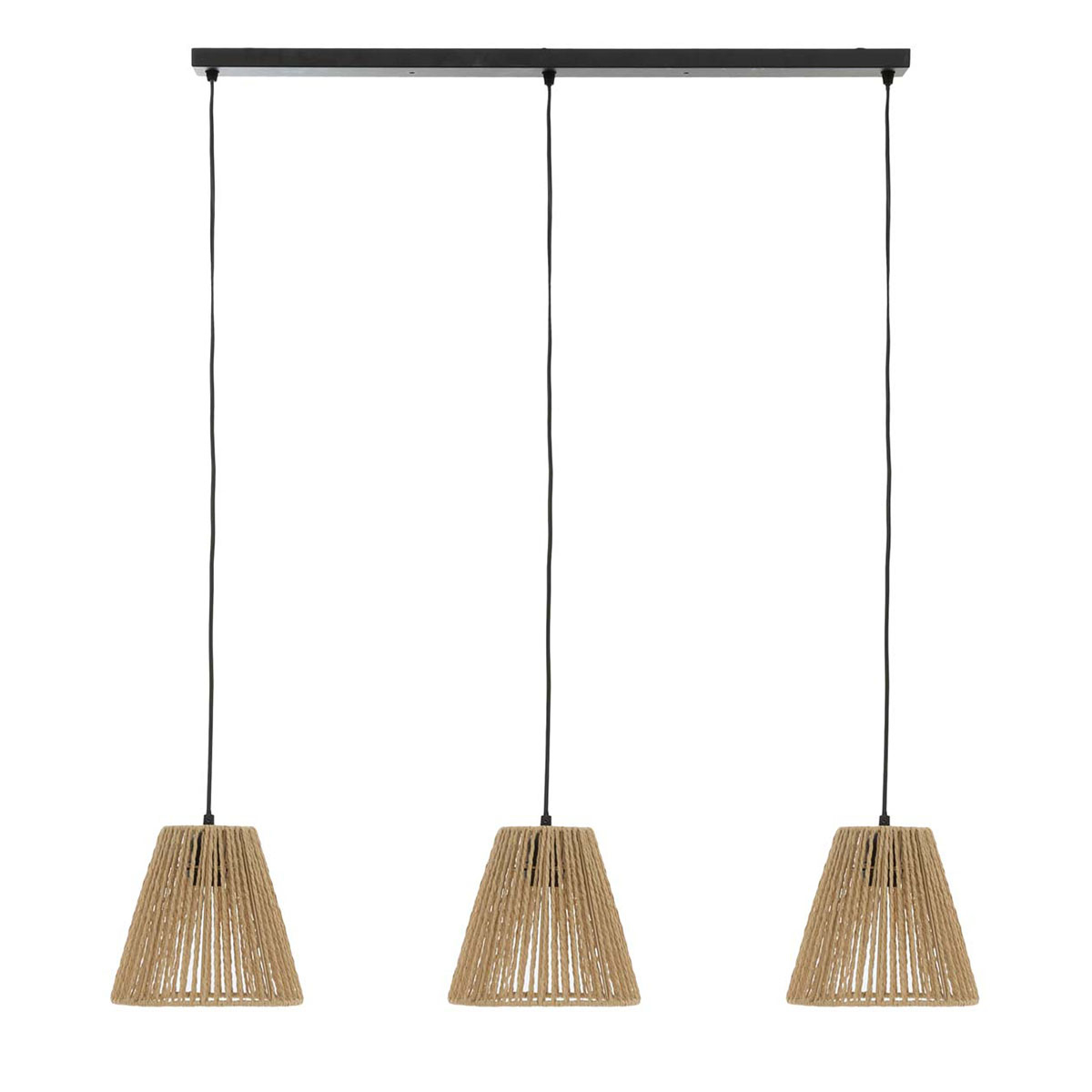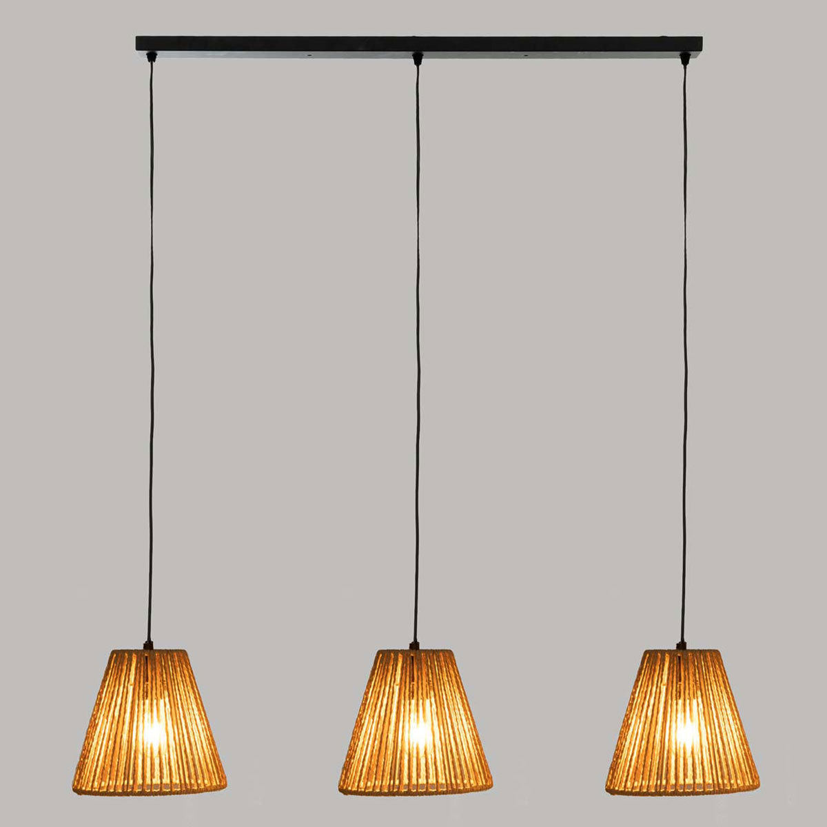 Τρίφωτο κρεμαστό φωτιστικό με ράγα με μοντέρνο ύφος. Τα καπέλα είναι κατασκευασμένα από χάρτινο σχοινί σε φυσική μπεζ απόχρωση. Το καλώδιο είναι κατασκευασμένο από PVC με μήκος 95εκ. έκαστος, παρέχοντας την δυνατότητα αυξομείωσης του συνολικού ύψους του φωτιστικού. Τύπος ντουί: 3xE27 και θέση για 3 λαμπτήρα έως 40W (δεν συμπεριλαμβάνονται).