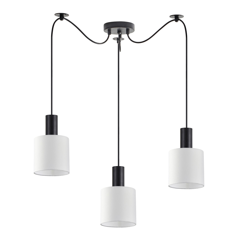 Φωτιστικό οροφής της εταιρείας Homelighting σε μοντέρνο στυλ. Είναι κατασκευασμένο από μέταλλο σε μαύρο χρώμα με 3 λευκά υφασμάτινα καπέλα. Υπάρχει δυνατότητα αυξομείωσης του συνολικού ύψους έως 300εκ. μέσω των καλωδίων και των στηριγμάτων οροφής. Η βάση τοποθέτησης είναι μαύρη μεταλλική. Τύπος ντουί: 3xE27 και θέσεις για 3 λαμπτήρες έως 60W έκαστος (δεν συμπεριλαμβάνονται). Τάση: 230Volt.