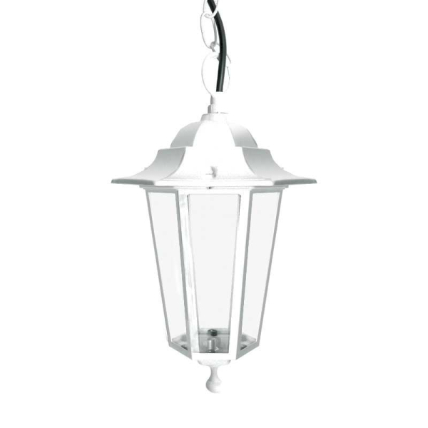 Εξάγωνο φανάρι οροφής εξωτερικού χώρου της εταιρείας Aca Decor. Με vintage σχεδιασμό είναι ιδανικό για να φωτίσετε και να διακοσμήσετε τον κήπο και τους εξωτερικούς χώρους του σπιτιού ή του εξοχικού σας. Είναι κατασκευασμένο από χυτό αλουμίνιο σε λευκό χρώμα και διαφανές γυαλί. Διαθέτει προστασία από υγρασία και σκόνη με βαθμό στεγανότητας IP44. Τύπος ντουί: 1xE27 και θέση για ένα λαμπτήρα οικονομίας έως 60W (δεν συμπεριλαμβάνεται). Τάση εισόδου 230V.