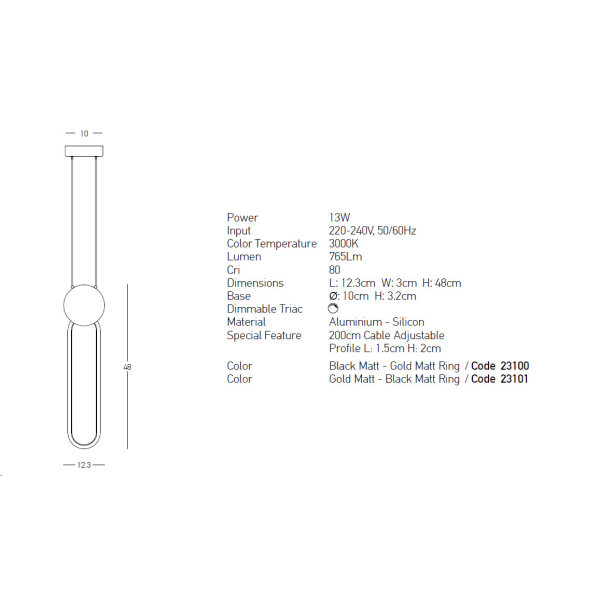 Φωτιστικό οροφής της εταιρείας Zambelis σε μοντέρνο στυλ. Είναι κατασκευασμένο από αλουμίνιο σε μαύρο ματ χρώμα με χρυσές λεπτομέρειες και σιλικόνη. Υπάρχει δυνατότητα αυξομείωσης του συνολικού ύψους έως 251εκ. μέσω των αναρτήσεων. Το φωτιστικό είναι ντιμαριζόμενο (dimmable) και συμβατό με όλα τα dimmer τύπου triac. Διαθέτει 1 ενσωματωμένη πλακέτα Led με ισχύ 13 Watt, θερμού λευκού φωτισμού 3000K και φωτεινότητας 765Lm. Τάση: 220-240Volt. Εγγύηση 2 χρόνια. Μετά το πέρας της εγγύησης, ενδεχόμενες επισκευές πραγματοποιούνται κατόπιν επικοινωνίας με τo Spitishop. Tο προϊόν θα αποσταλεί στον επίσημο προμηθευτή, ο οποίος καθορίζει και το κόστος επισκευής.