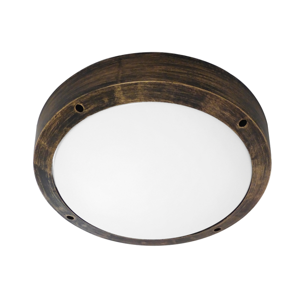 Στρογγυλή πλαφονιέρα εξωτερικού χώρου της εταιρείας Heronia. Διαθέτει προστασία από υγρασία και σκόνη με βαθμό στεγανότητας IP54 και είναι κατάλληλη και για εξωτερικούς χώρους. Μπορεί να τοποθετηθεί σε τοίχο ή οροφή. Σε μίνιμαλ στυλ είναι ιδανική για να φωτίσετε και να διακοσμήσετε τον κήπο και τους εξωτερικούς χώρους του σπιτιού ή του εξοχικού σας. Είναι κατασκευασμένη από πλαστικό υλικό σε μπρονζέ απόχρωση με εφέ παλαίωσης και φέρει οπάλ κάλυμμα. Τύπος ντουί: 2xE27 και θέσεις για 2 λαμπτήρες **ΑΠΟΚΛΕΙΣΤΙΚΑ LED έως 10W έκαστος** (δεν συμπεριλαμβάνονται). Δεν περιλαμβάνονται οι βίδες στερέωσης.