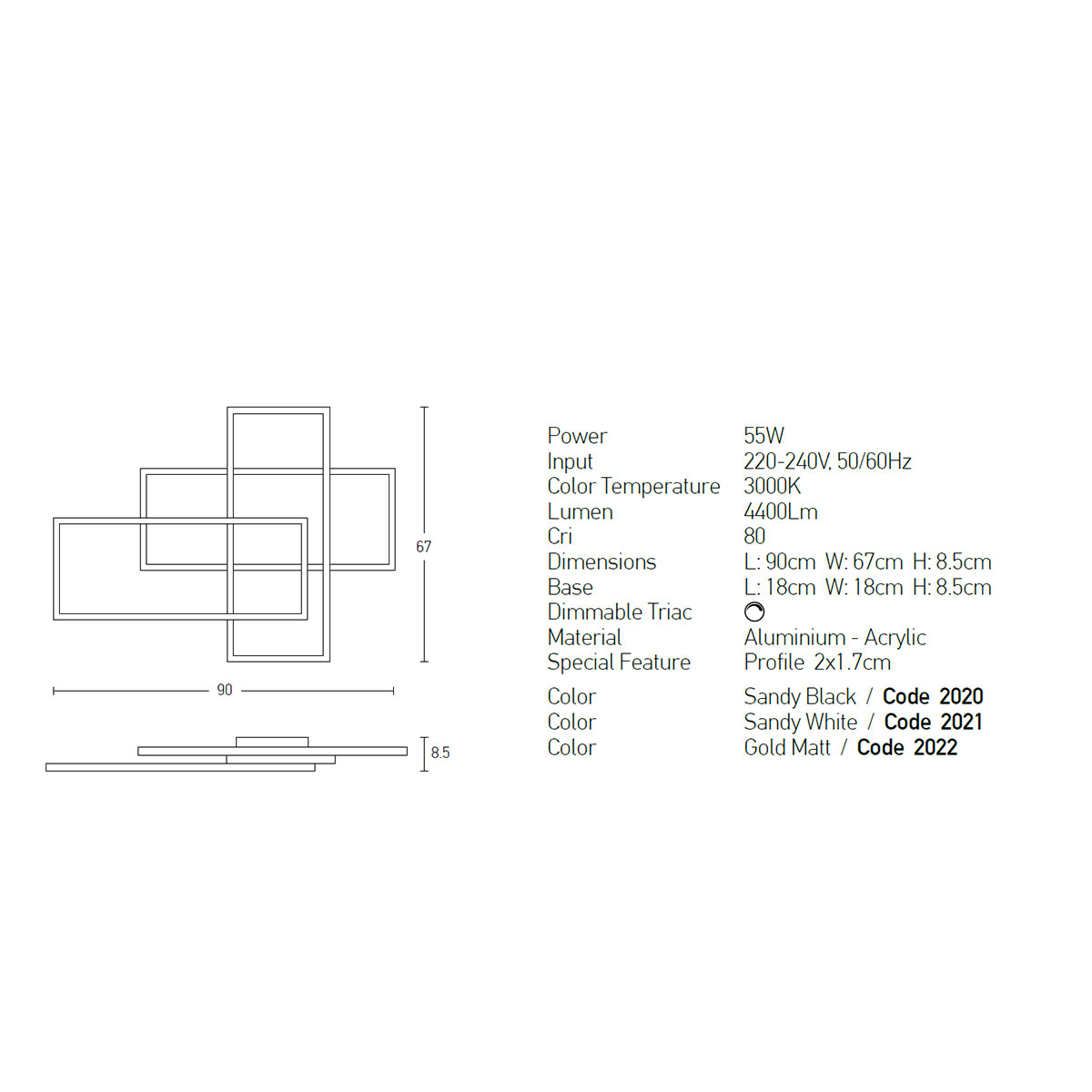 • Τεμάχια: 1 Πλαφονιέρα Οροφής 90εκ.Μx67εκ.Πx8.5εκ.Υ & Βάση 18εκ.Μx18εκ.Πx8.5εκ.Υ