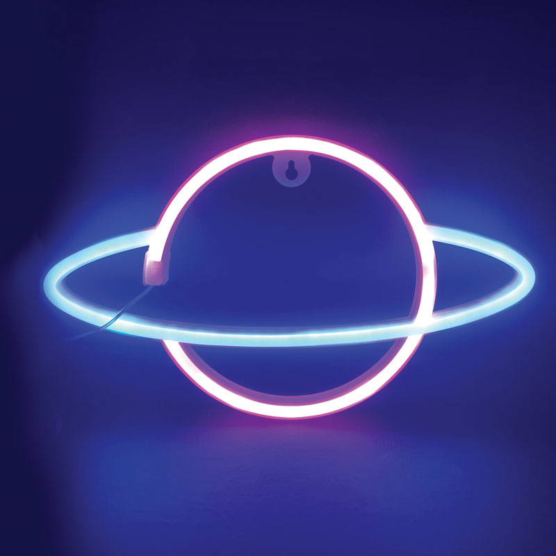 Επιτοίχιο διακοσμητικό Neon Led φωτιστικό της εταιρείας Aca Decor. Έχει μοντέρνο σχήμα πλανήτη σε ροζ και μπλε απόχρωση. Είναι κατασκευασμένο από πλαστικό υλικό και σιλικόνη σε και είναι κατάλληλο για να στολίσει το παιδικό και βρεφικό δωμάτιο. Λειτουργεί με καλώδιο USB ή με 3 μπαταρίες AA LR6, οι οποίες δεν περιλαμβάνονται. Φέρει ενσωματωμένες πλακέτες Led συνολικής ισχύος 2.4Watt.