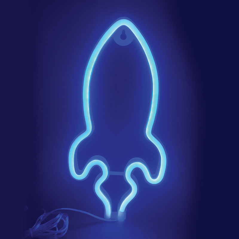 Επιτοίχιο διακοσμητικό Neon Led φωτιστικό της εταιρείας Aca Decor. Έχει μοντέρνο σχήμα πυραύλου σε μπλε χρώμα. Είναι κατασκευασμένο από πλαστικό υλικό και σιλικόνη σε και είναι κατάλληλο για να στολίσει το παιδικό και βρεφικό δωμάτιο. Λειτουργεί με καλώδιο USB ή με 3 μπαταρίες AA LR6, οι οποίες δεν περιλαμβάνονται. Φέρει ενσωματωμένες πλακέτες Led συνολικής ισχύος 2.4Watt.