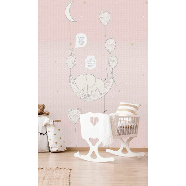 Ενιαία παιδική ταπετσαρία τοίχου από την συλλογή Sofie & Junar της εταιρείας Behang Expresse. Έχει μοντέρνο σχέδιο σε ροζ απόχρωση με χρυσά αστεράκια. Πρόκειται για χάρτινη φωτοταπετσαρία υψηλής ποιότητας και ιταλικής κατασκευής με Vlies - Non Woven υπόστρωμα. Η επιφάνειά της είναι λεία κατασκευασμένη από πολυτελές χαρτί ψηφιακής εκτύπωσης. Αποτελείται από 2 ρολά προκειμένου να ολοκληρωθεί το ενιαίο σχέδιο της φωτογραφίας. Το υπόλοιπο σχέδιο στο κέντρο της φωτογραφίας πωλείται ξεχωριστά (κωδικός INK7625-BEH). Ιδανική για να τοποθετηθεί και στο βρεφικό ή παιδικό δωμάτιο δίνοντας μία παραμυθένια αίσθηση στο χώρο.