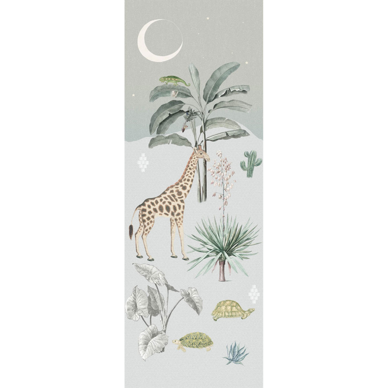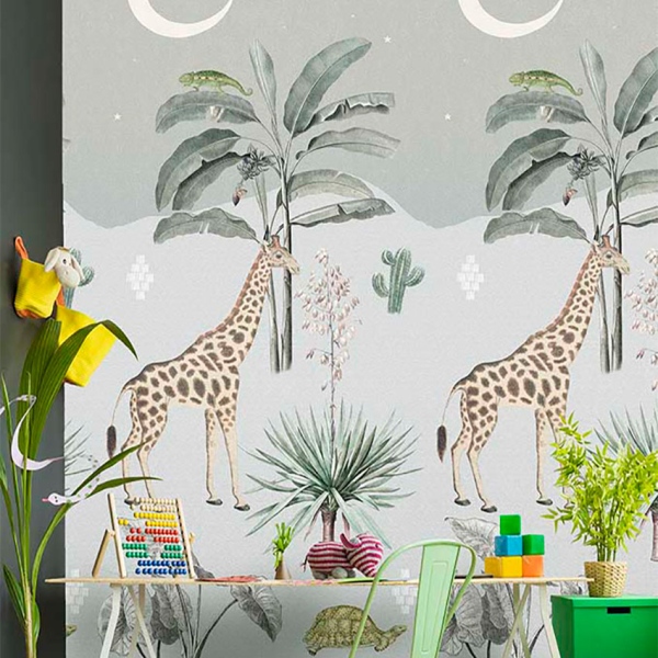 Ενιαία παιδική ταπετσαρία τοίχου από την συλλογή Sofie & Junar της εταιρείας Behang Expresse. Έχει tropical σχέδιο με καμηλοπαρδάλεις σε γαλάζιες κι πράσινες αποχρώσεις. Πρόκειται για χάρτινη φωτοταπετσαρία υψηλής ποιότητας και ιταλικής κατασκευής με Vlies - Non Woven υπόστρωμα. Η επιφάνειά της είναι λεία κατασκευασμένη από πολυτελές χαρτί ψηφιακής εκτύπωσης. Αποτελείται από 2 ρολά προκειμένου να ολοκληρωθεί το ενιαίο σχέδιο της φωτογραφίας. Ιδανική για να τοποθετηθεί και στο βρεφικό ή παιδικό δωμάτιο δίνοντας μία παραμυθένια αίσθηση στο χώρο.