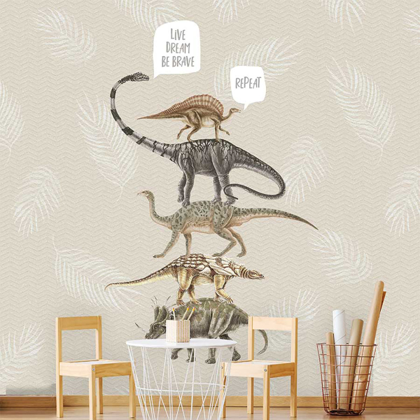 Ενιαία παιδική ταπετσαρία τοίχου από την συλλογή Sofie & Junar της εταιρείας Behang Expresse. Έχει σχέδιο με δεινόσαυρους σε μπεζ φόντο. Πρόκειται για χάρτινη φωτοταπετσαρία υψηλής ποιότητας και ιταλικής κατασκευής με Vlies - Non Woven υπόστρωμα. Η επιφάνειά της είναι λεία κατασκευασμένη από πολυτελές χαρτί ψηφιακής εκτύπωσης. Αποτελείται από 4 ρολά προκειμένου να ολοκληρωθεί το ενιαίο σχέδιο της φωτογραφίας. Ιδανική για να τοποθετηθεί και στο βρεφικό ή παιδικό δωμάτιο δίνοντας μία παιχνιδιάρικη αίσθηση στο χώρο.