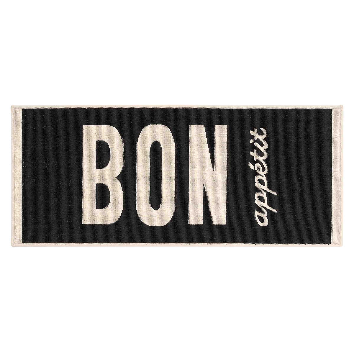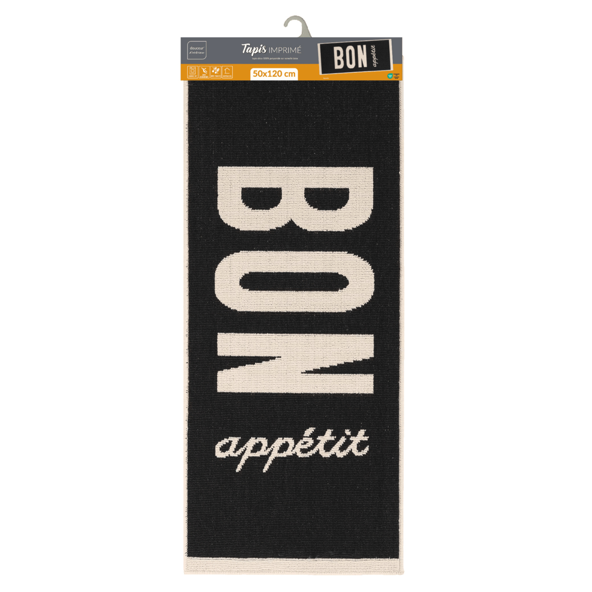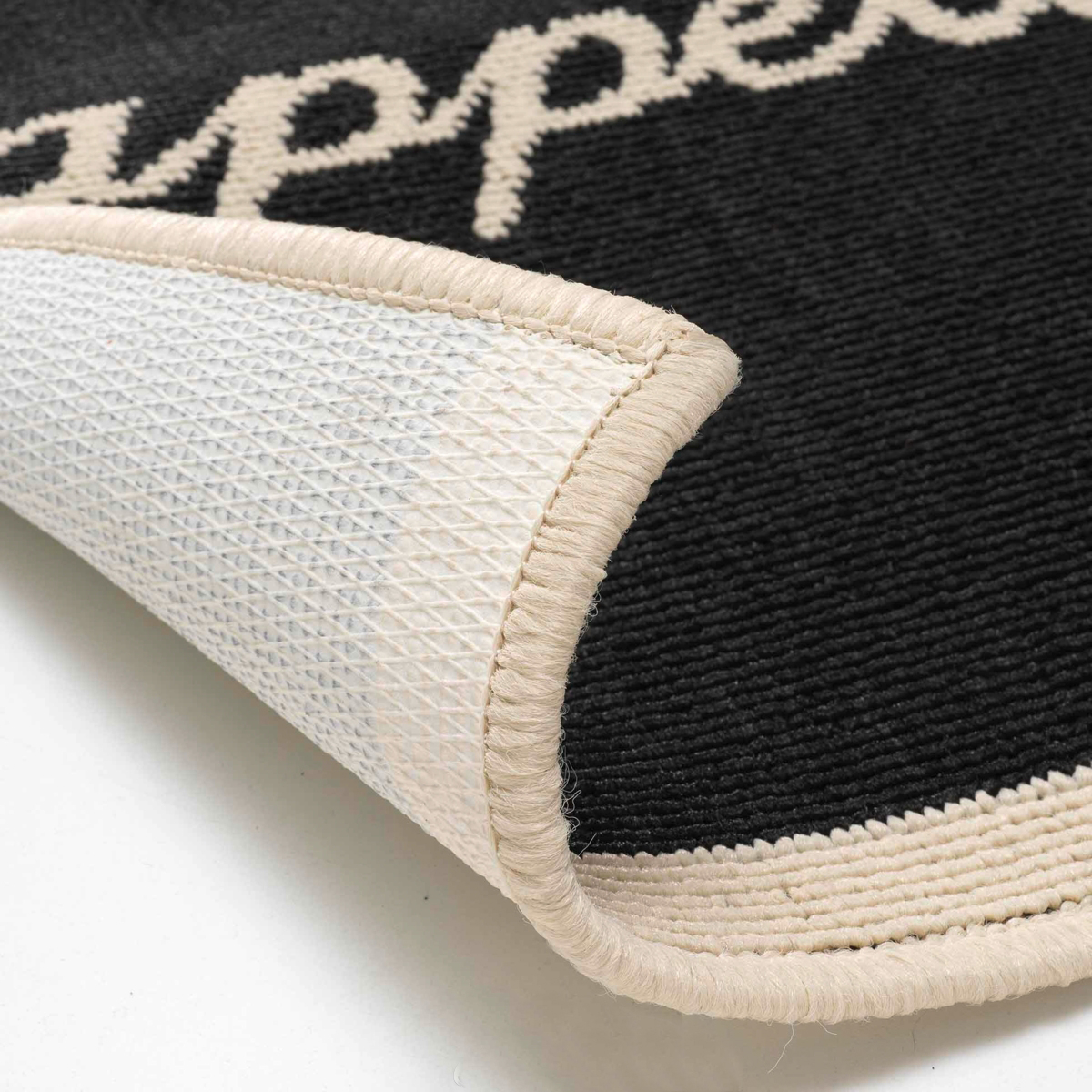 Χαλί διαδρόμου σε μαύρο χρώμα με μοντέρνο σχέδιο και εκρού λεπτομέρειες. Είναι κατασκευασμένο από 100% πολυπροπυλένιο και η κάτω πλευρά του είναι 100% λάτεξ με αντιολισθητικές ιδιότητες.