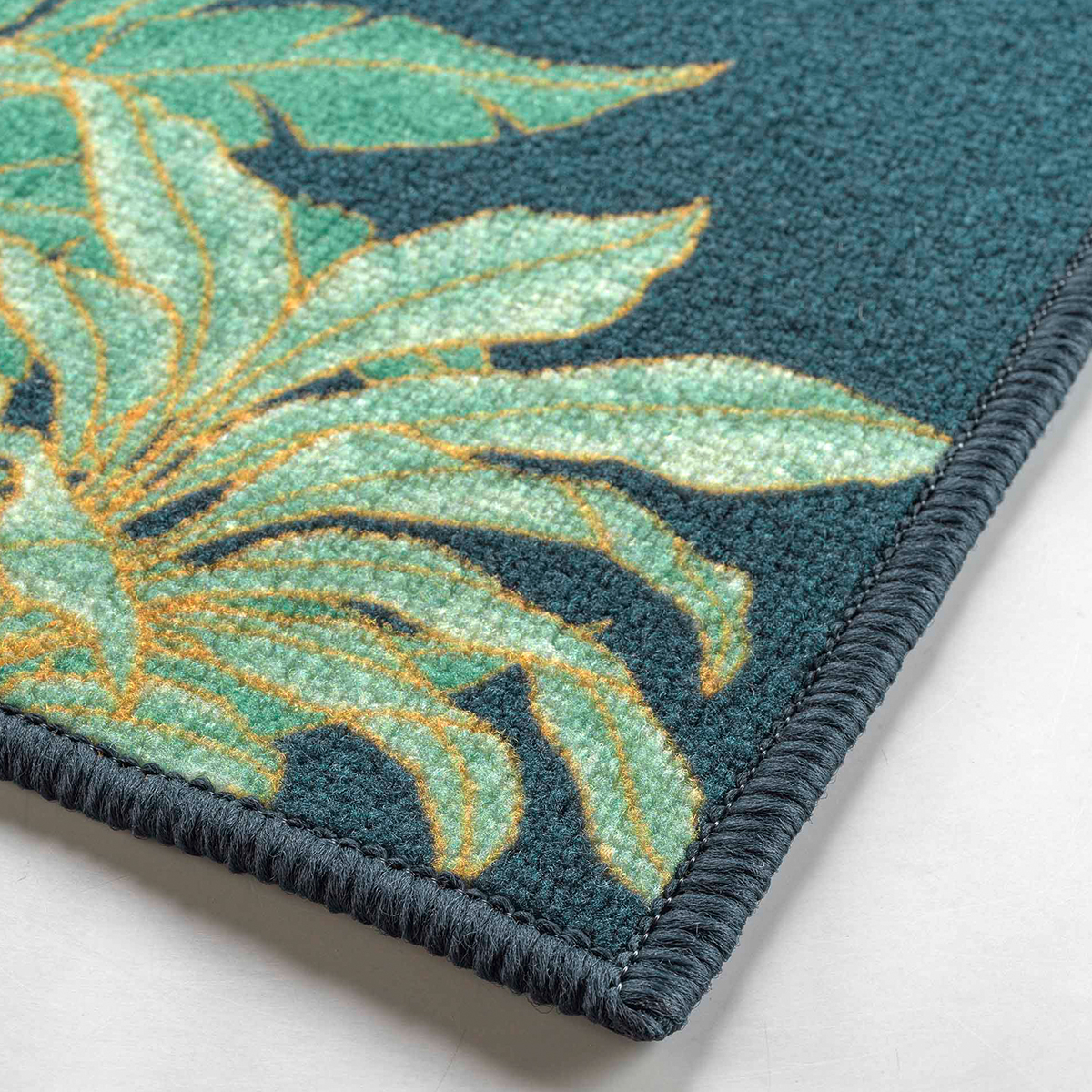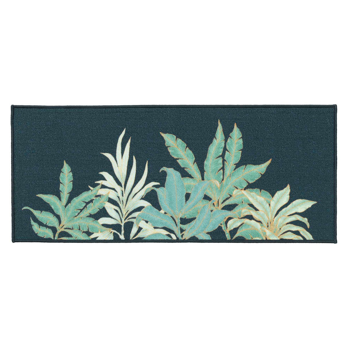 Χαλί διαδρόμου σε μπλε σκούρο χρώμα με τυρκουάζ tropical σχέδιο. Η πάνω πλευρά είναι κατασκευασμένη από 100% πολυαμίδιο, ενώ η κάτω πλευρά είναι από latex με αντιολισθητικές ιδιότητες. Καθαρίζεται εύκολα με ηλεκτρική και ρομποτική σκούπα και είναι δανικό για την διακόσμηση της κουζίνας σας.