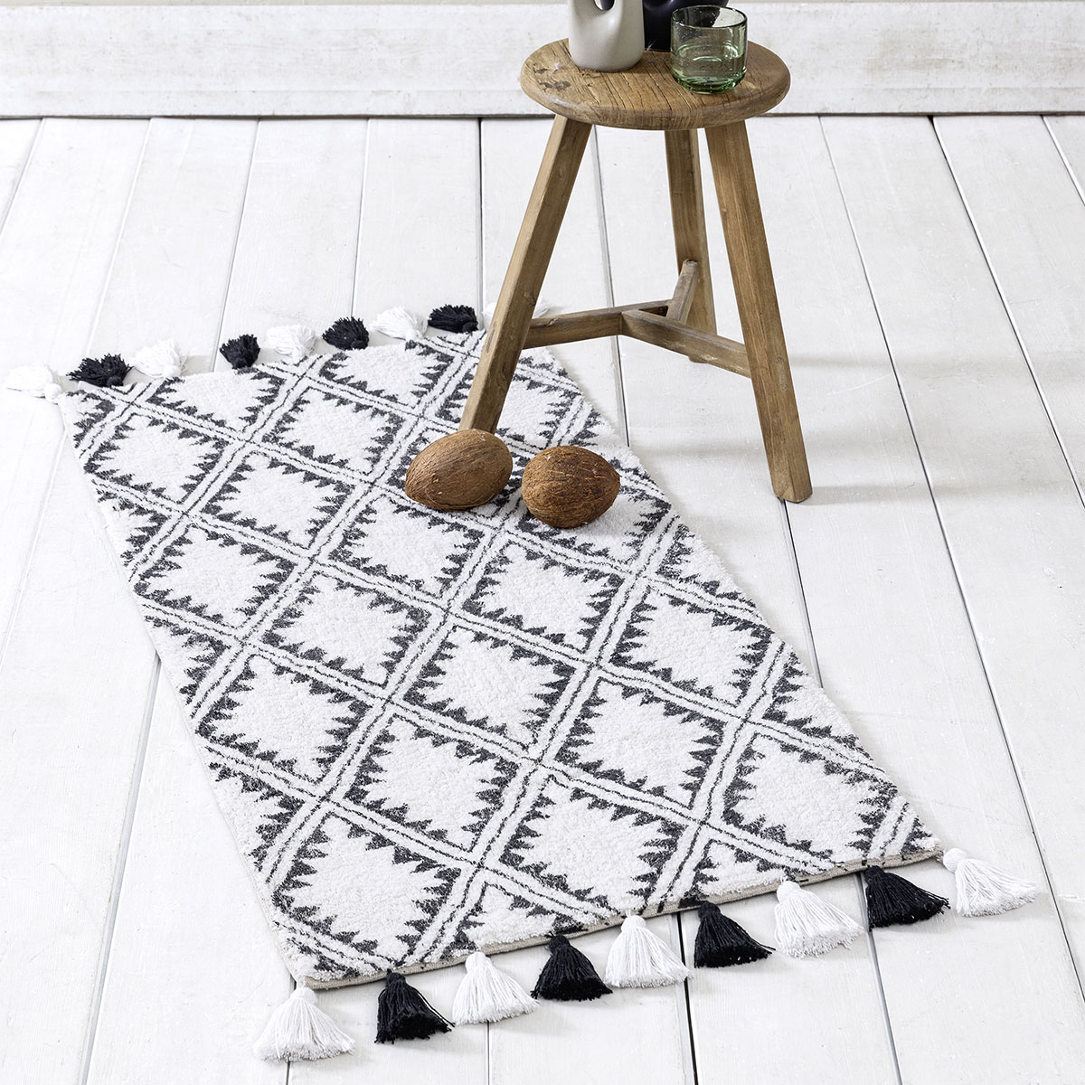 Xαλί διαδρόμου από την εταιρεία Nima.Έχει λευκό χρώμα, με μαύρες λεπτομέρειες και έθνικ σχέδιο. Είναι κατασκευασμένο από 100% βαμβάκι και διαθέτει μακριά κρόσια στο τελείωμα. Είναι ιδανικό για τοποθέτηση σε οποιονδήποτε χώρο του σπιτιού σας όλο τον χρόνο.