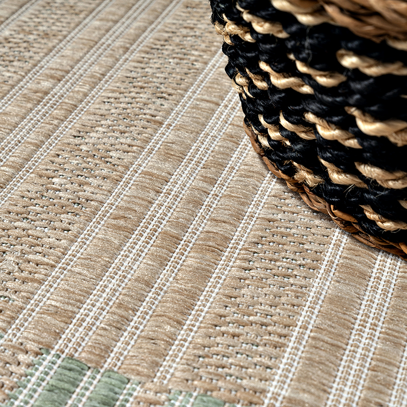 Μηχανοποίητο χαλί 160x230 από την συλλογή Stella της εταιρείας New Plan. Έχει μπεζ χρώμα με λαχανί λεπτομέρειες και μοντέρνο σχέδιο. Πρόκειται για εξαιρετική ψάθα, ιδανική για τους καλοκαιρινούς μήνες. Μπορεί να τοποθετηθεί σε όλους τους χώρους του σπιτιού, αναβαθμίζοντας την αισθητική τους. Επίσης, είναι κατάλληλο και για στεγασμένους εξωτερικούς χώρους. Είναι κατασκευασμένο με ανεξίτηλα νήματα εξαιρετικής ποιότητας, με σύνθεση 100% πολυπροπυλένιο. Το βάρος του είναι 1.050gsm. Η πυκνότητά του ανέρχεται στους 14.800 κόμπους. Είναι αντιστατικό άρα το σκούπισμα με ηλεκτρική σκούπα είναι εύκολο και αποτελεσματικό. Τα χαλιά της εταιρείας New Plan είναι υποαλλεργικά και φιλικά προς την υγεία και το περιβάλλον.