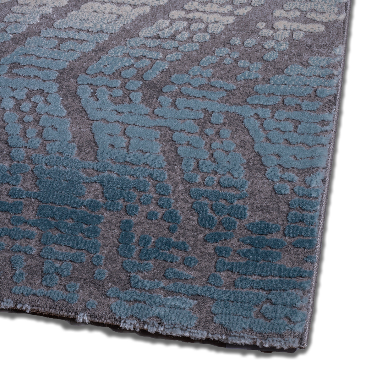 Χαλί μηχανής από τη σειρά Thema της εταιρείας Colore Colori με μοντέρνο σχέδιο σε γκρι και μπλε αποχρώσεις. Το πυκνό τρίχωμα και τα λαμπερά νήματα σχηματίζουν ανάγλυφα και αφαιρετικά σχέδια στο χαλί. Η σύνθεσή του είναι 70% heatset Πολυπροπυλένιο και 30% Polyester, ενώ το βάρος του είναι 2.570gsm. Το χαλί έχει υφανθεί με λεπτά συμπαγή νήματα, τα οποία έχουν ιδανικό συνδυασμό ύψους πέλους 12mm και πυκνής πλέξης. Η εξελιγμένη επεξεργασία των ινών του, δημιουργεί μνήμη για να επανέρχονται στην αρχική τους θέση, παρά την καθημερινή χρήση. Η εξαιρετικά καλή ποιότητα των ανεξίτηλων νημάτων και η προστασία κατά των λεκέδων καθιστούν εύκολα το καθάρισμα λεκέδων και το σκούπισμα με ηλεκτρική σκούπα. To υπόστρωμα χαλιού είναι γερά πλεγμένο, στην ίδια μηχανή κατασκευής, χωρίς πρόσθετα και κόλλες. Είναι αντιστατικό επομένως δεν μαγνητίζονται χνούδια, μικροσωματίδια και σκόνη στην επιφάνεια του χαλιού. Το χαλί είναι αντιαλλεργικό και η αντιβακτηριδιακή του προστασία εμποδίζει την ανάπτυξη αποικιών από ακάρεα, για μέγιστη προστασία της υγείας. Η σειρά Thema έχει πιστοποίηση του Γερμανικού ινστιτούτου Oeko-Tex Standard 100 και πιστοποίηση 11.ΗΤΡ.94219 από το ινστιτούτο Hohenstein για την μη ύπαρξη ουσιών επιβλαβών προς την υγεία. Εγγύηση 2 ετών.
